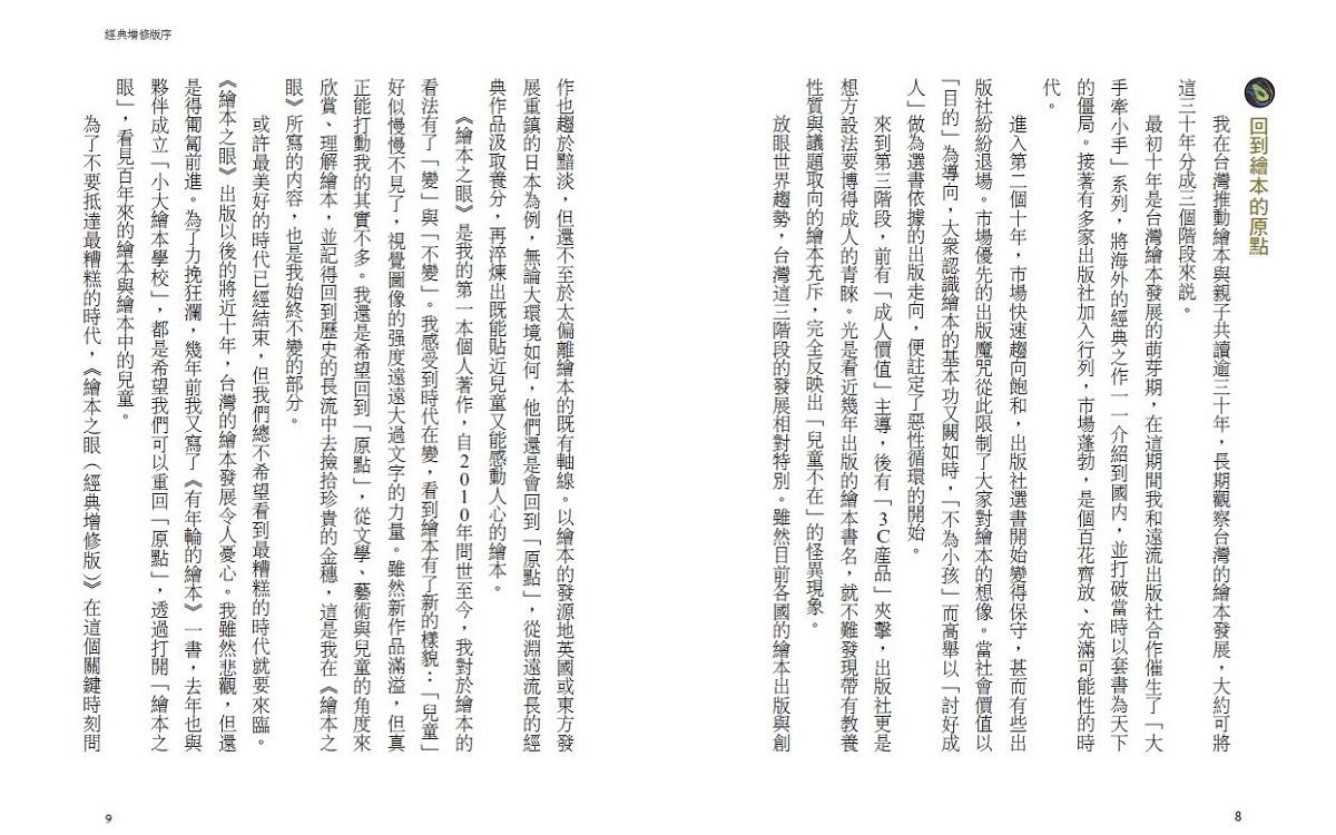 《繪本之眼》是我的第一本個人著作,自2010年問世至今,我對於繪本的看法有了「變」與「不變」。我感受到時代在變,看到繪本有了新的樣貌:「兒童」好似慢慢不見了,視覺圖像的強度遠遠大過文字的力量。雖然新作品滿溢,但真正能打動我的其實不多。我還是希望回到「原點」,從文學、藝術與兒童的角度來欣賞、理解繪本,並記得回到歷史的長流中去撿拾珍貴的金穗,這是我在《繪本之眼》所寫的內容,也是我始終不變的部分。