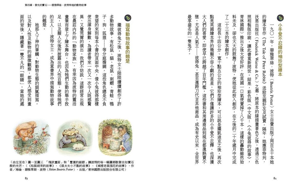 《小兔彼得的故事》可以說是繼凱迪克之後,再次點亮英國繪本界不容小覷的星星。不僅讓許多的小孩愛不釋手,也深獲大人們的喜愛。即使早已跨越百年門檻,繪本和其周邊商品至今仍熱賣不墜,尤其是跨刀代言其他商品的「彼得兔」,成為有史以來,全世界最享盛名的一隻兔子。此章節將解析為何波特女士筆下的動物總是栩栩如生,及這些繪本之所以經得起歷史考驗的祕密。
