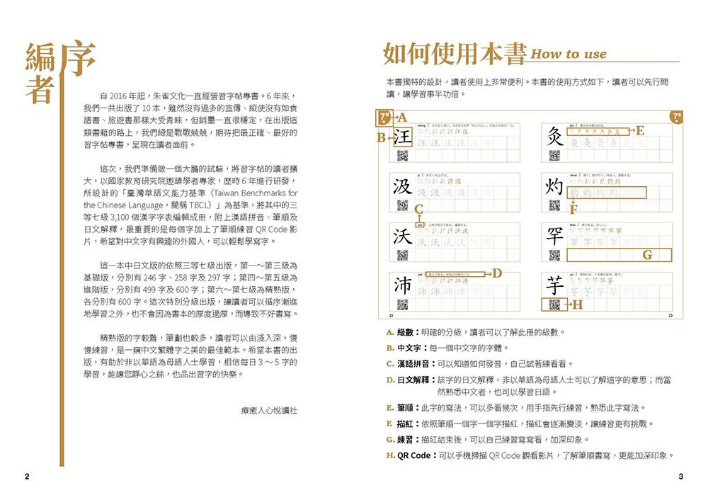 本書依「國家教育研究院」建置之臺灣華語文能力基準(TBCL)包括:聽、說、讀、寫、譯三等七級能力指標為基礎,其中「寫」之部分最為困難,因此,本書特別將每個字附上漢語拼音、日文解釋和完整筆順,最重要的是每個字加上了筆順練習QR Code影片,解決外國人學習寫字的困擾。除此之外,還附上練字基本工的基礎內容,是本適合學習繁體中文字初入門的好幫手。