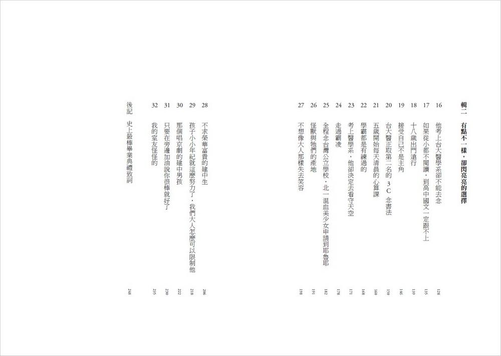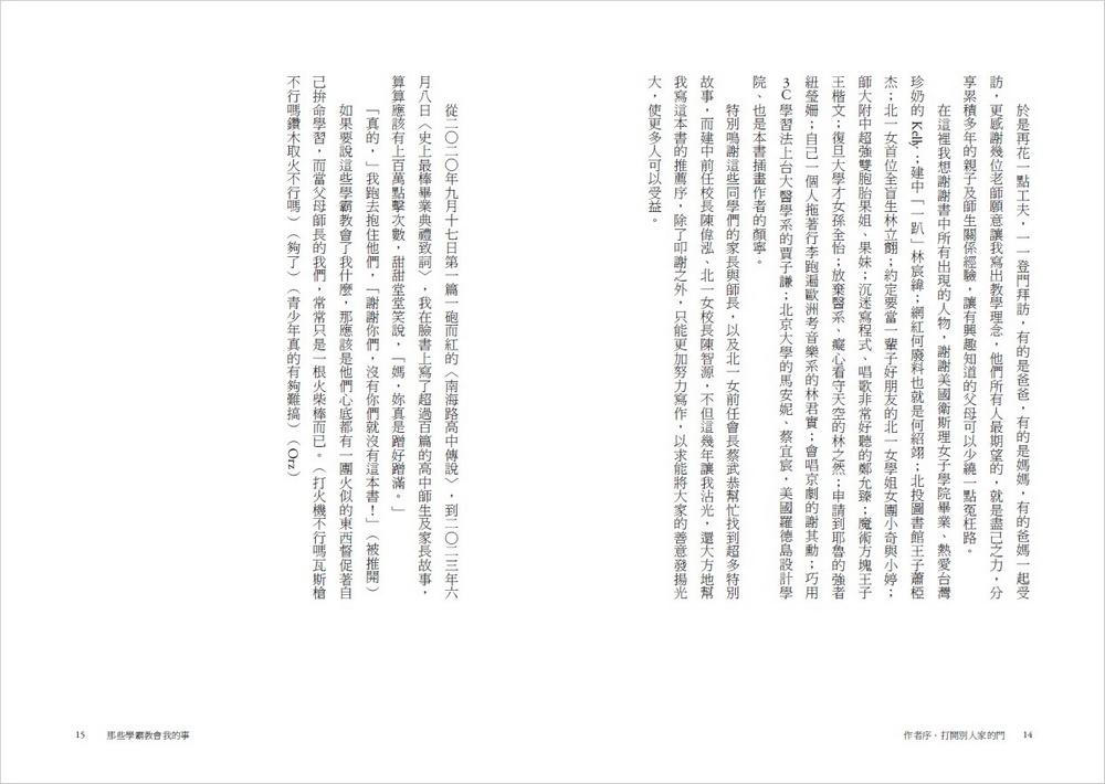 在這裡我想謝謝書中所有出現的人物,謝謝美國衛斯理女子學院畢業、熱愛台灣珍奶的Kelly ;建中「一趴」林宸緯;網紅何廢料也就是何紹翊;北投圖書館王子蕭椏杰;北一女首位全盲生林立翧;約定要當一輩子好朋友的北一女學姐女團小奇與小婷;師大附中超強雙胞胎果姐、果妹;沉迷寫程式、唱歌非常好聽的鄭允臻;魔術方塊王子王楷文;復旦大學才女孫全怡;放棄醫系、癡心看守天空的林之然;申請到耶魯的強者紐瑩姍;自己一個人拖著行李跑遍歐洲考音樂系的林君實;會唱京劇的謝其勳;巧用3C學習法上台大醫學系的賈子謙;北京大學的馬安妮、蔡宜宸,美國羅德島設計學院、也是本書插畫作者的顏寧。
