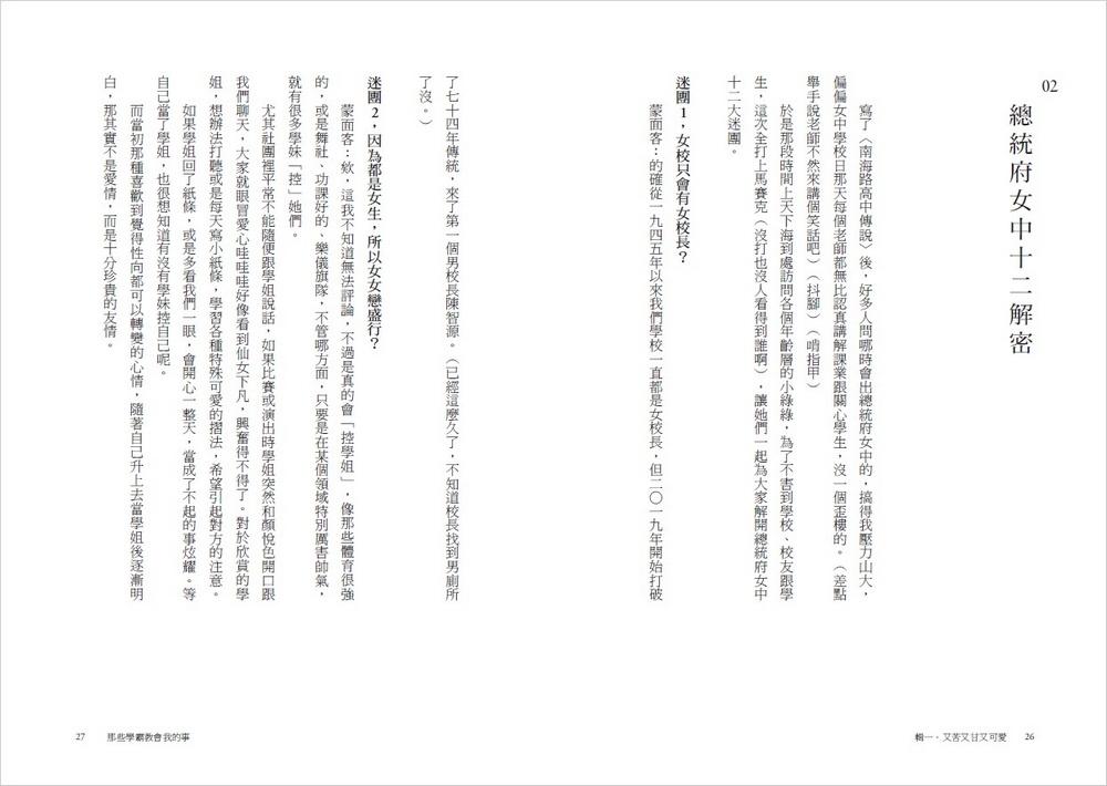 北一女的學生被要求五育並重,術德兼修,不論是考科或非考科,每個老師都跟你來真的,沒有偷懶怠惰的餘地,外界大概很難想像,高三學生還能認真完成美術作品、三千公尺測驗等。北一女的學生也是自我要求很高,凡事認真,全力以赴。資深老師都知道不能隨便跟學生討論事情,因為每個學生都跟你來真的,一定要把道理講明白,把細節弄清楚,沒有敷衍搪塞的餘地。有時候,家長會跟我抱怨:女兒來到北一女以後,開始變得比較不聽話。通常我會建議(安慰)家長:那就換我們開始練習好好聽話(聽女兒說話)。因為北一女的學生不喜歡接受已經被安排好的事物,不喜歡被他人定義,反而是複雜未知的道路更能引起她們的興趣。當一位學生樂於接受挑戰,願意把全部心力投入自己所熱愛的事物,就是我心目中的學霸。這些學霸教會我:要努力把每一件事都做好,然後盡全力把自己熱愛的那件事做到最好。