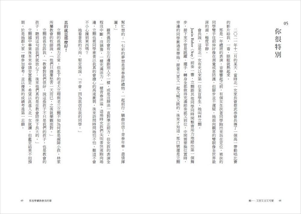 就算考進同一個學校,每屆八、九百個學生中,便有八、九百條不同的人生道路,對甜甜堂堂而言,他們也有自己羨慕的同學跟學長姐,這些也都是別人家的小孩,而我只是巧遇其中幾位,並且非常榮幸地能寫下他們青春時代的自我探索歷程。