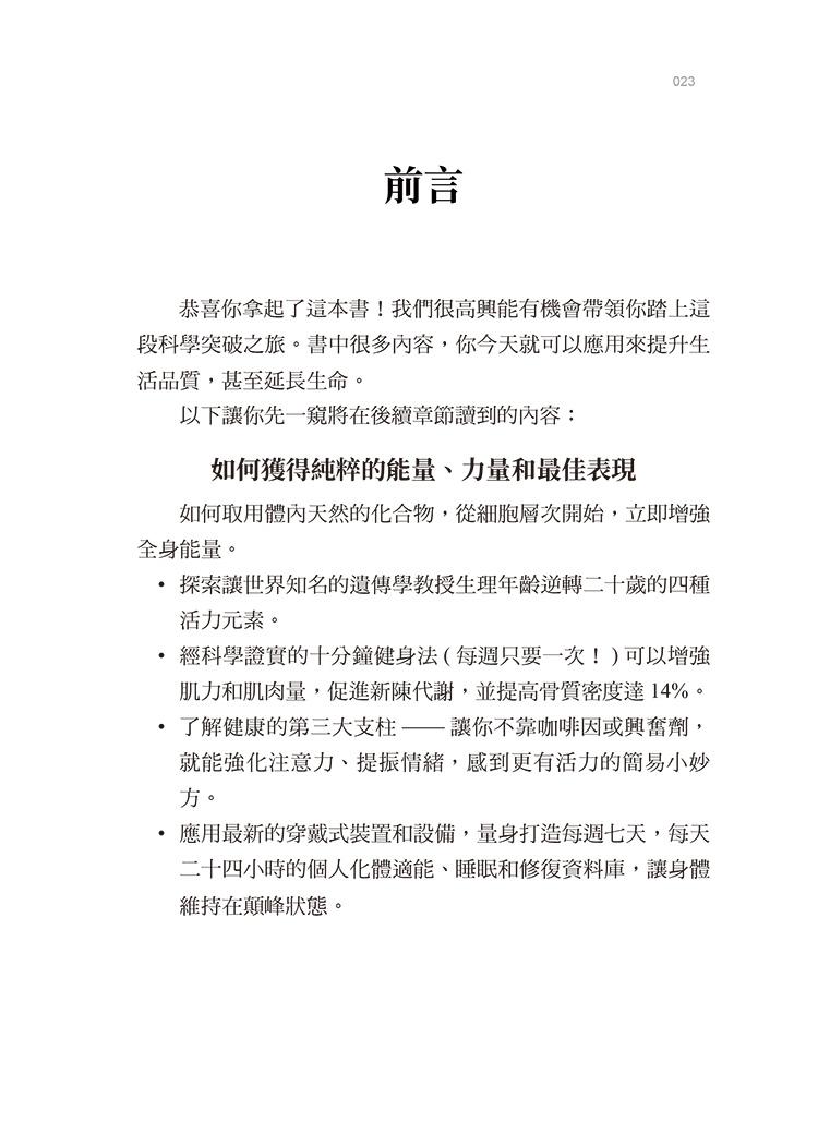 恭喜你拿起了這本書!我們很高興能有機會帶領你踏上這段科學突破之旅。書中很多內容,你今天就可以應用來提升生活品質,甚至延長生命。