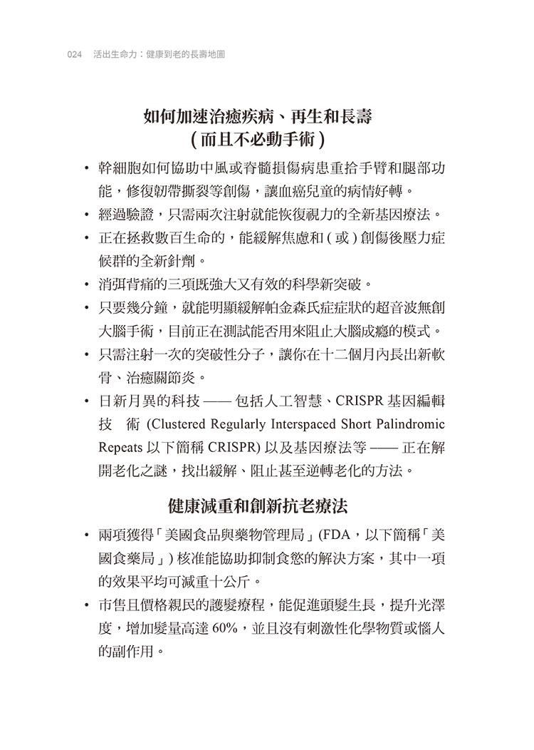 在《活出生命力》中,你會學到精準醫療—各種CRISP基因編輯技術、基因療法、幹細胞等技術如何強化我們的能量、體力、與健康壽命並如何治癒最令人聞之色變的疾病…