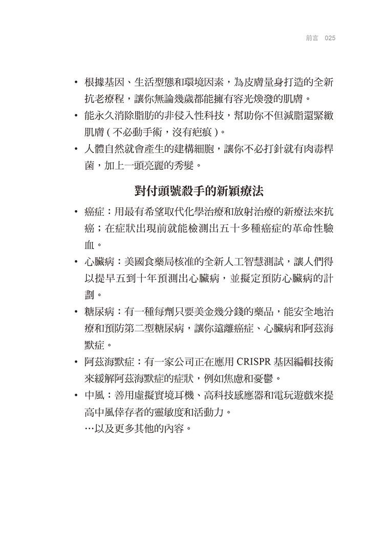 本書的宗旨是分享現在就能用的、驚人的工具和療法的最新資訊,以及即將獲得美國食藥局核准的工具和療法,讓我們能在許多常見的健康問題變得失控之前及時解決。想像一下,如果能在第零期癌症還完全可以治癒時就發現,那該有多好。如果能了解自己的遺傳風險因子,知道目前可以運用哪些工具來降低或阻止該風險不幸成真,那不是無價之寶嗎?再想像一下,只要改變生活型態,就能避免心臟病和糖尿病等退化性問題,這會讓人多麼充滿力量啊!你知道嗎,有家公司正在針對治療關節炎的工具進行第三期試驗,讓你能像青少年一樣重新長出新的軟骨?許多進展太神奇,聽起來像是二十年或三十年以後才會發生的事,但事實是,許多療法目前已經是現在進行式了!