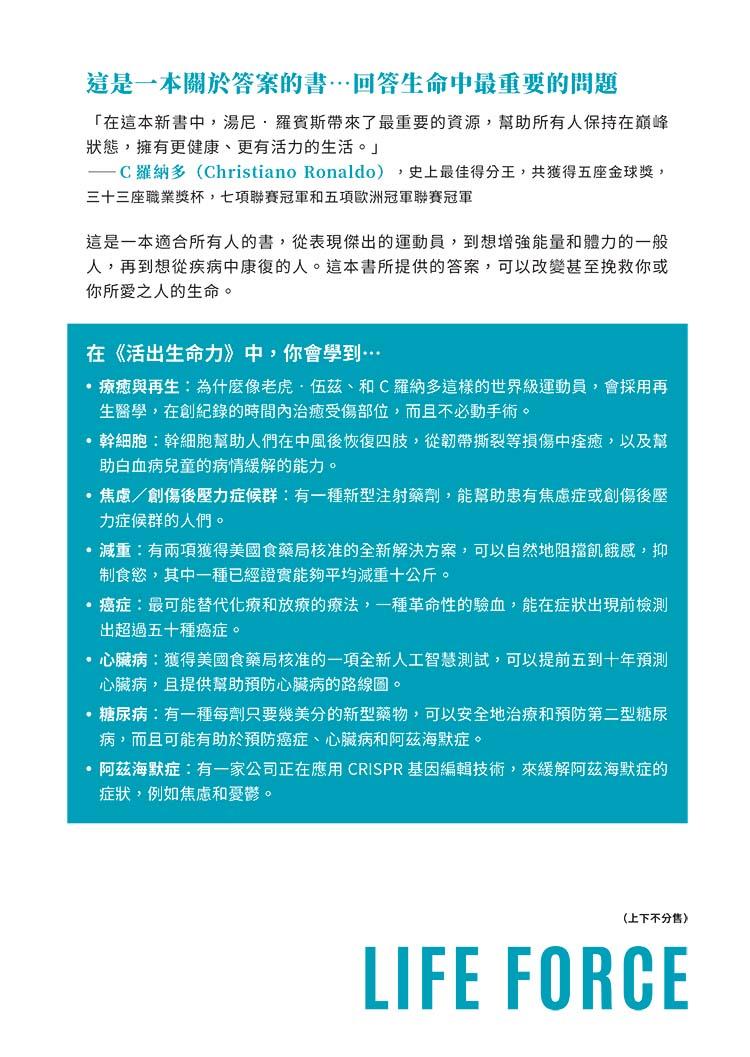 在《活出生命力》一書中,湯尼‧羅賓斯介紹了一百多位世界頂級醫學人士最新的研究結果、鼓舞人心的再生故事以及精準醫學的驚人進展,為讀者打造了全面解易讀的健康地圖。所有想要提升健康和活力,延長健康壽命的人,都可以按圖索驥,找到適合自己的解答和延長壽命的秘訣。
