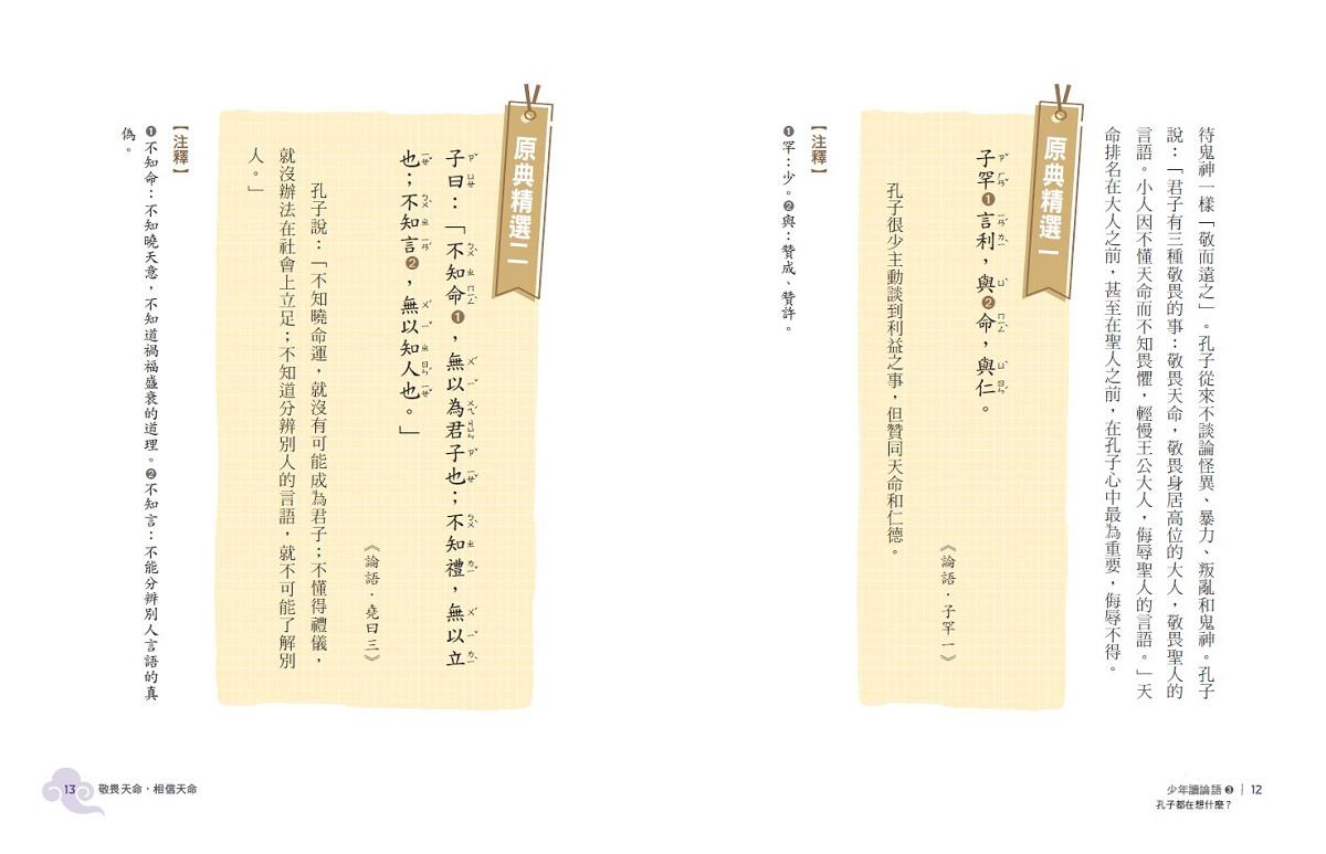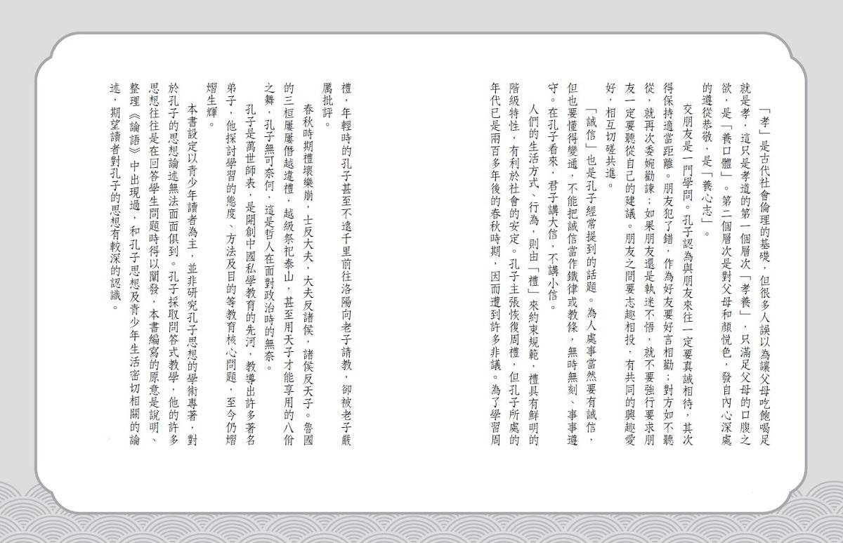 本書設定以青少年讀者為主,並非研究孔子思想的學術專著,對於孔子的思想論述無法面面俱到。孔子採取問答式教學,他的許多思想往往是在回答學生問題時得以闡發,本書編寫的原意是說明、整理《論語》中出現過,和孔子思想及青少年生活密切相關的論述,期望讀者對孔子的思想有較深的認識。