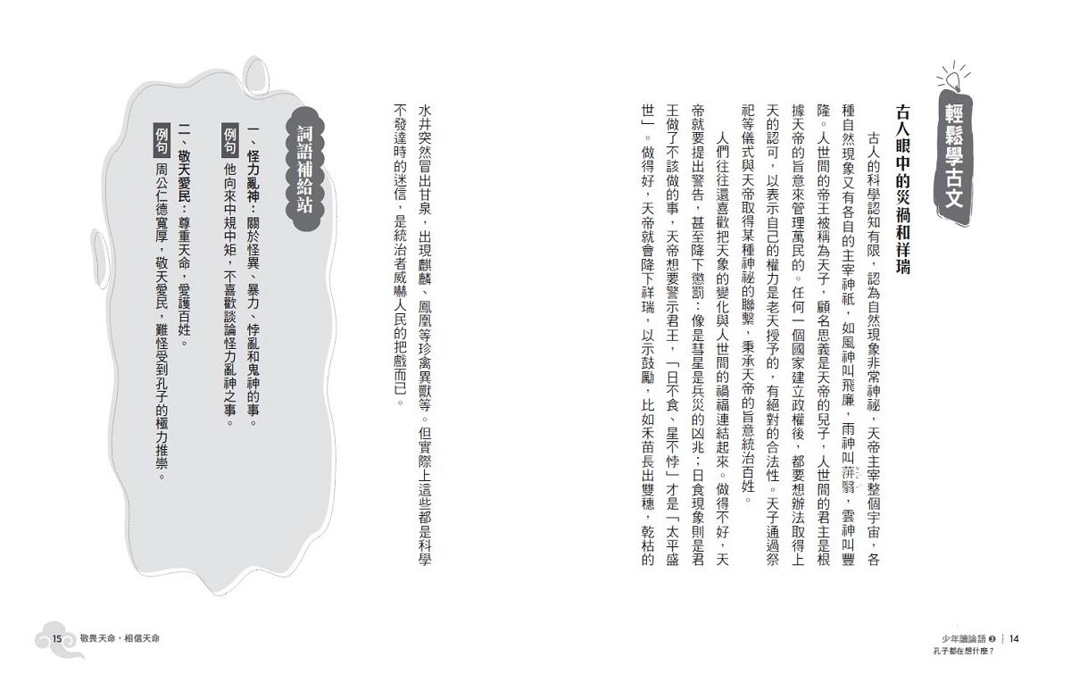 《少年讀論語》提供一個全面認識孔子的機會,了解他的生平,看他遇過那些人生難關,也認識一下他那些多才多藝的門生,讓孩子心中模糊的哲人形象更清晰,知道孔子也是個有血有淚、會犯錯有時甚至會強詞奪理的人,而不是高高在上的聖人。