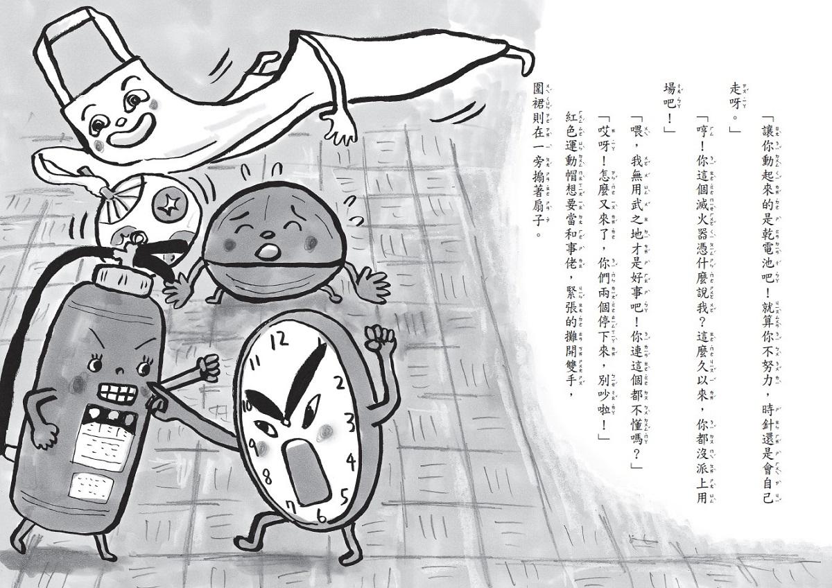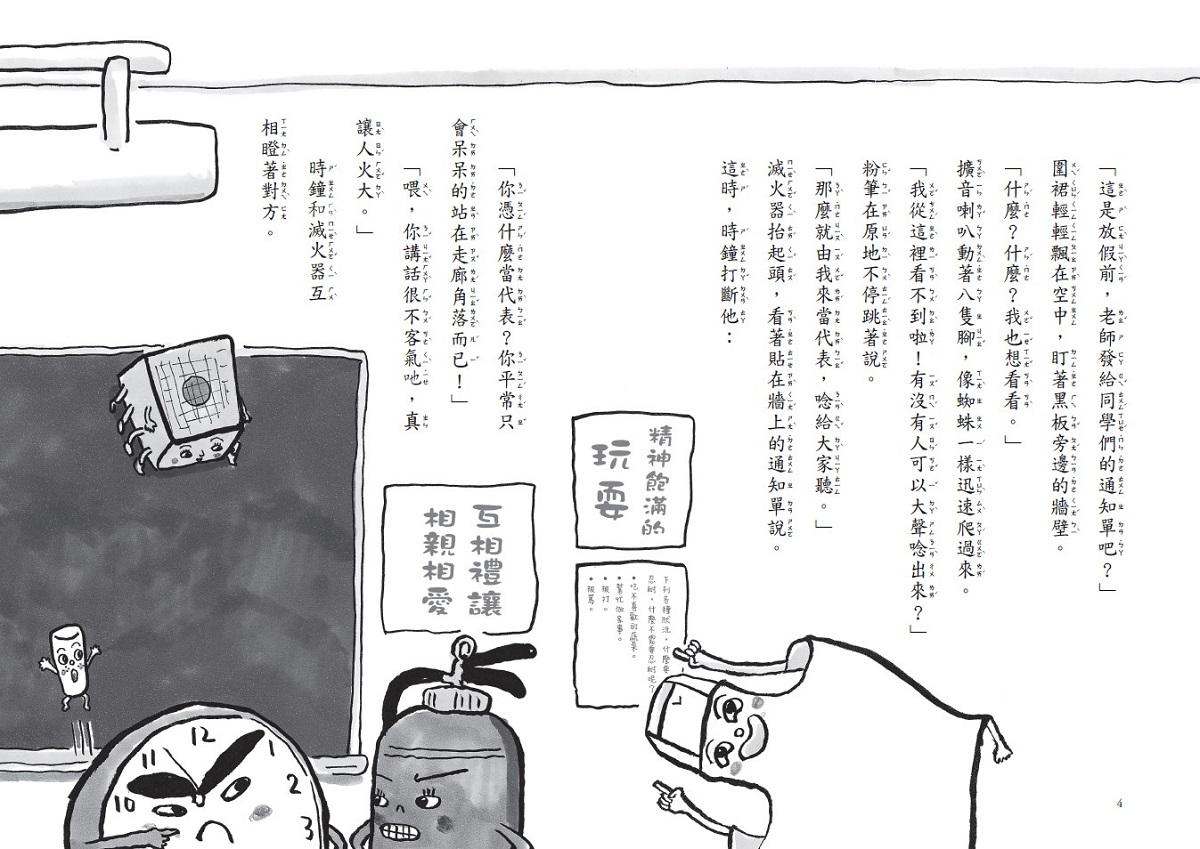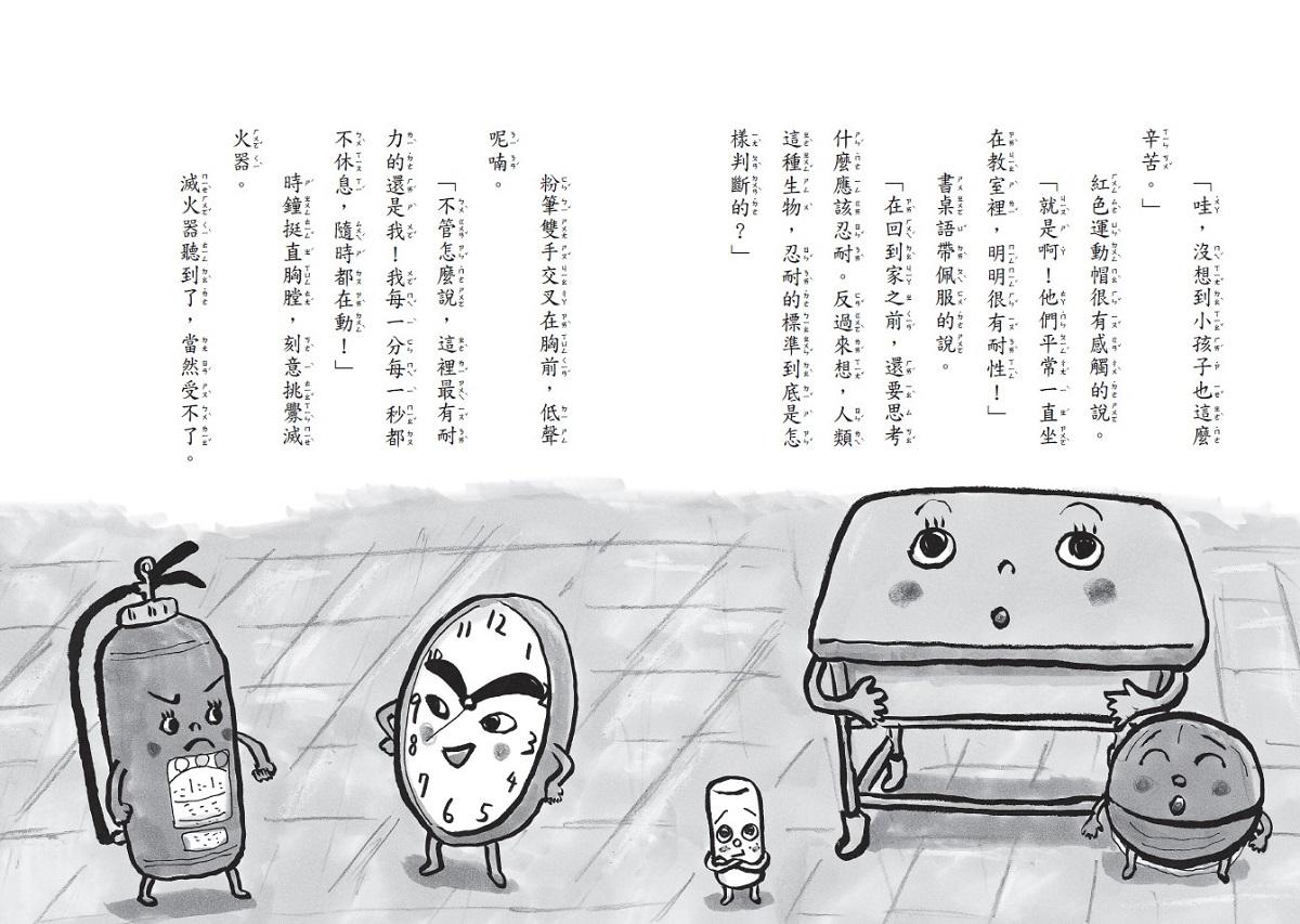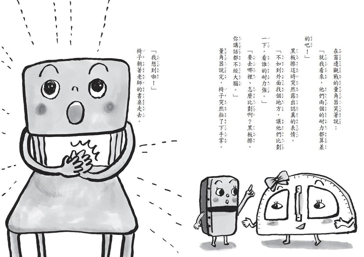 滅火器、擴音喇叭、時鐘、粉筆、圍裙、量角器、黑板擦等,活潑逗趣又鬼點子一堆的夥伴們,要來告訴你:最好的朋友也可以是彼此的對手,最重要的是互相鼓勵、支持的珍貴友誼!