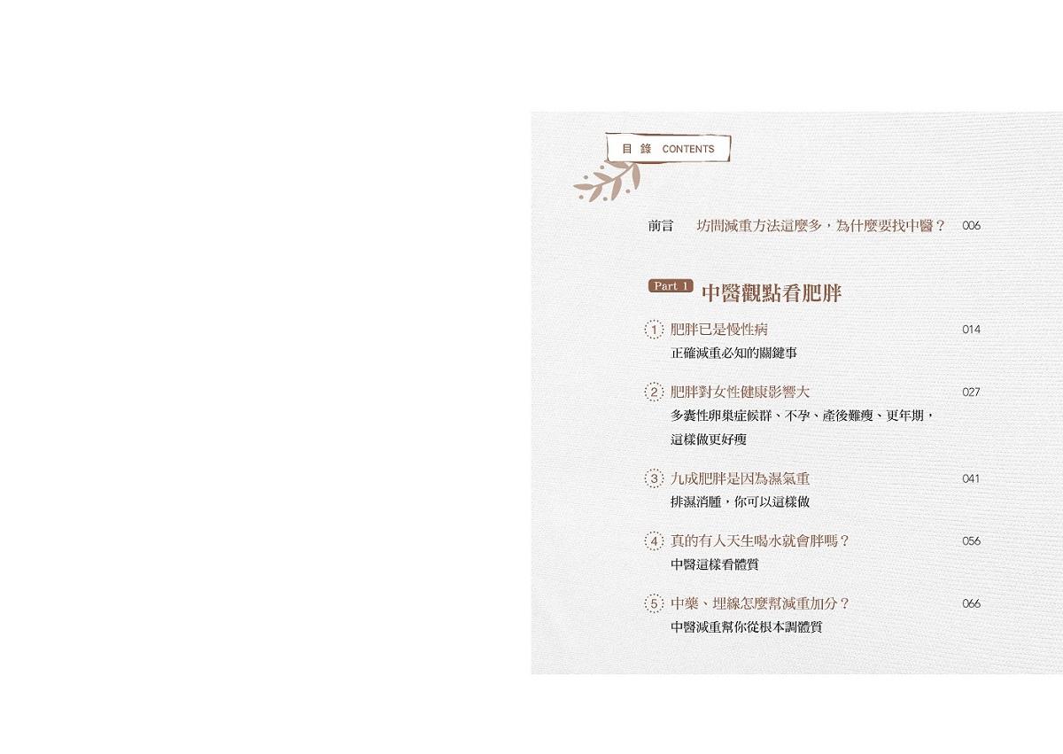 減重方法百百種,現在你不用再煩惱該怎麼選擇了,中醫減重能客製化找到適合你的方式,並搭配飲食與生活調整,不過度極端,才能持之以恆。最後也希望透過本書,引導民眾建立正確的減重觀念,了解透過中藥控制體重的同時,也能一併做到由體內根本調理,讓身體恢復平衡,讓健康減重之路更加順利。當看見真的有機會改變,成就感也會油然而生,祝福讀者們有機會因為減重,迎向更健康的自己!