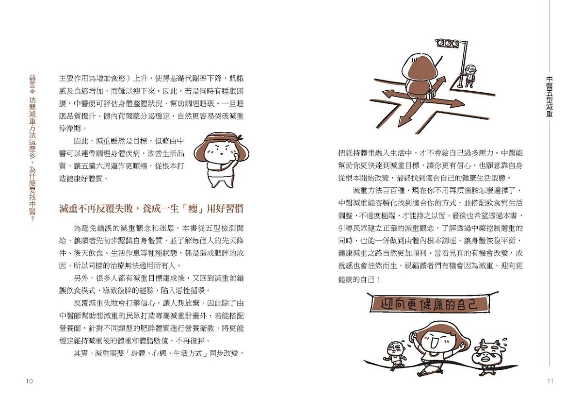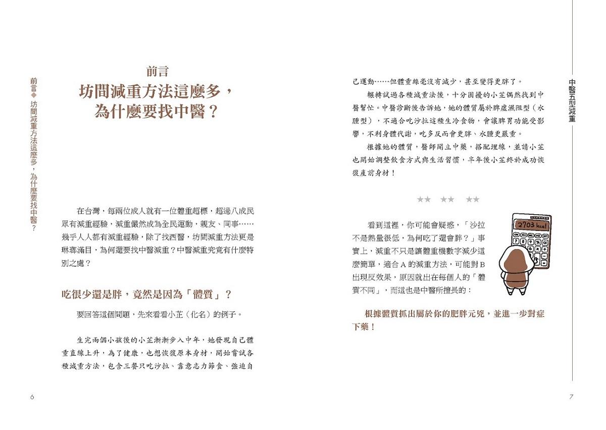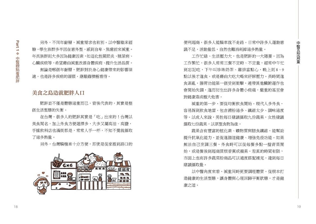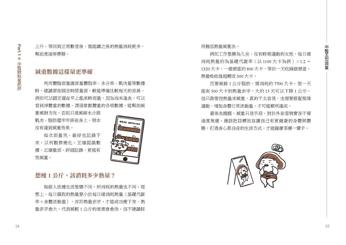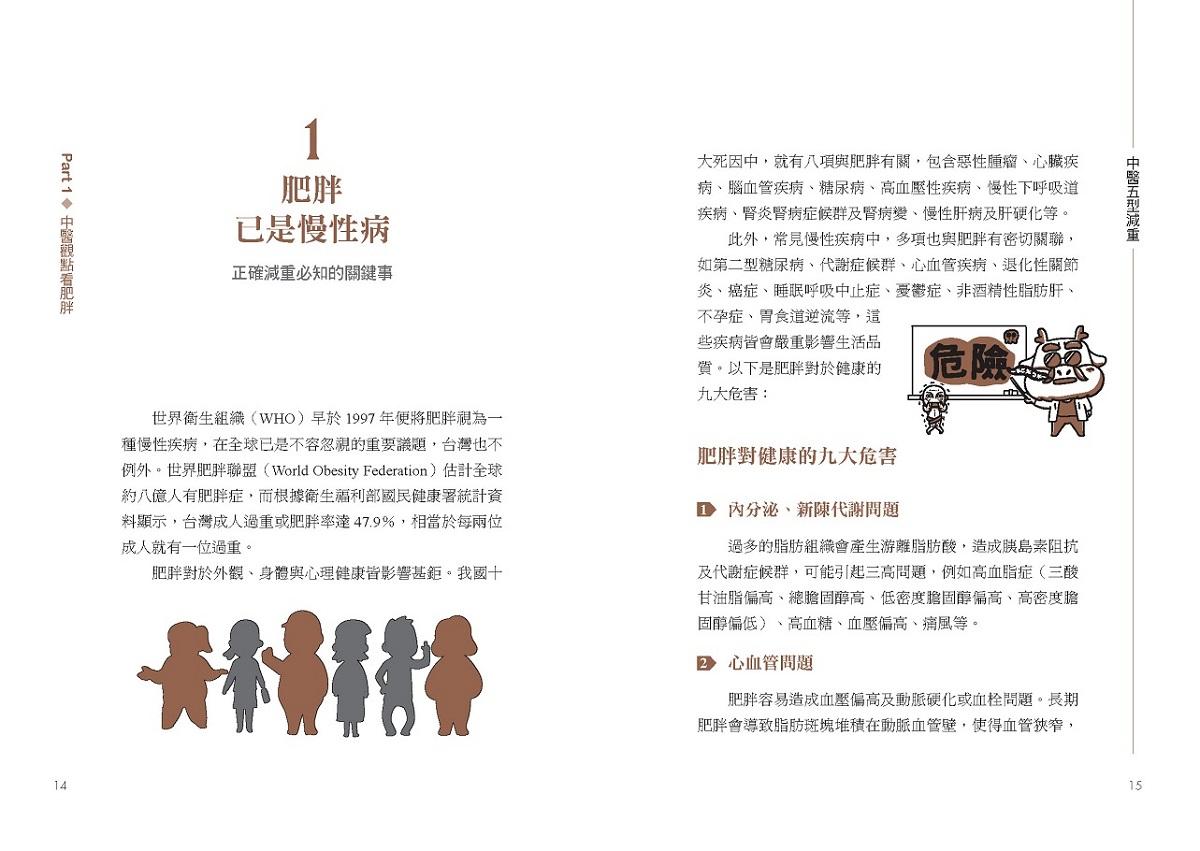 為避免錯誤的減重觀念和迷思,本書從五型檢測開始,讓讀者先初步認識自身體質,並了解每個人的先天條件、後天飲食、生活作息等種種狀態,都是造成肥胖的成因,所以同樣的治療無法適用所有人。