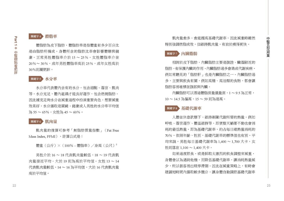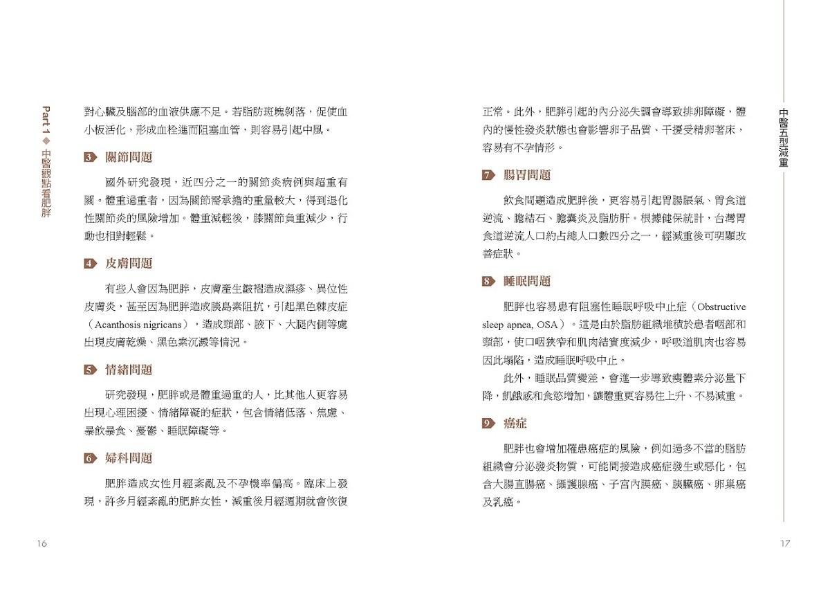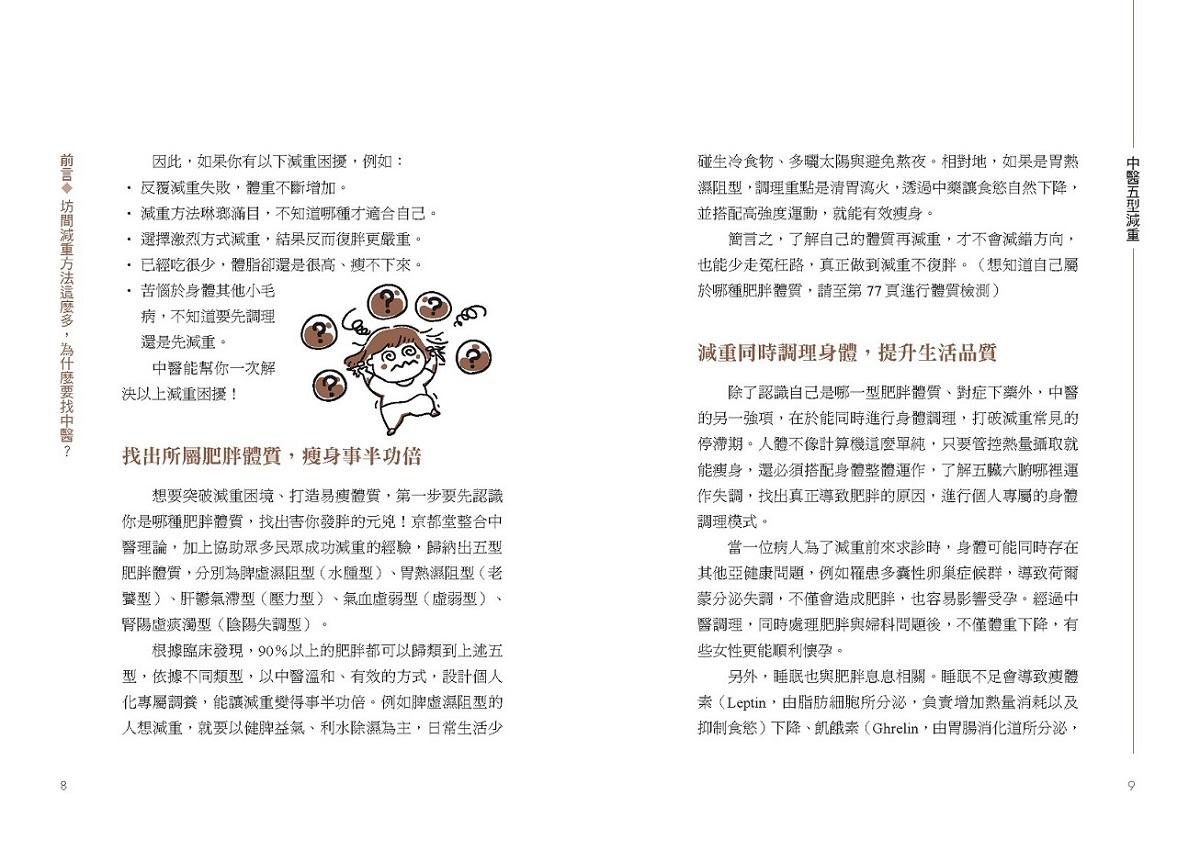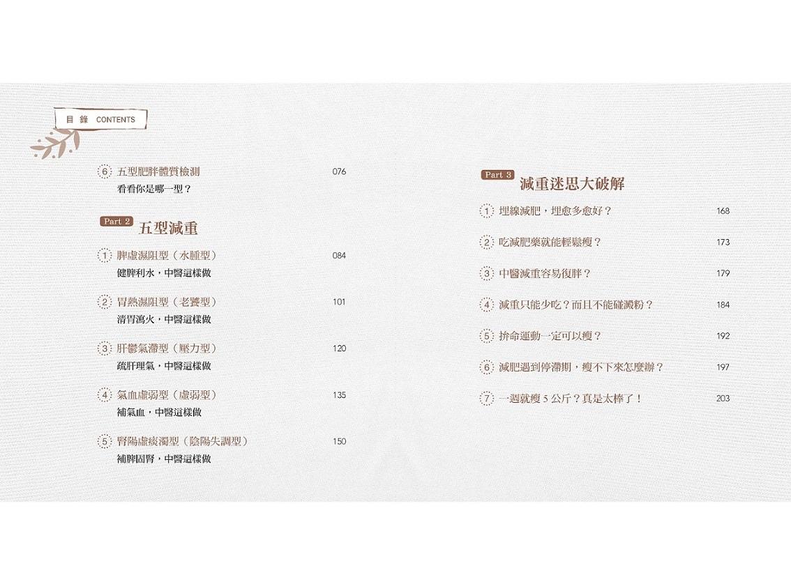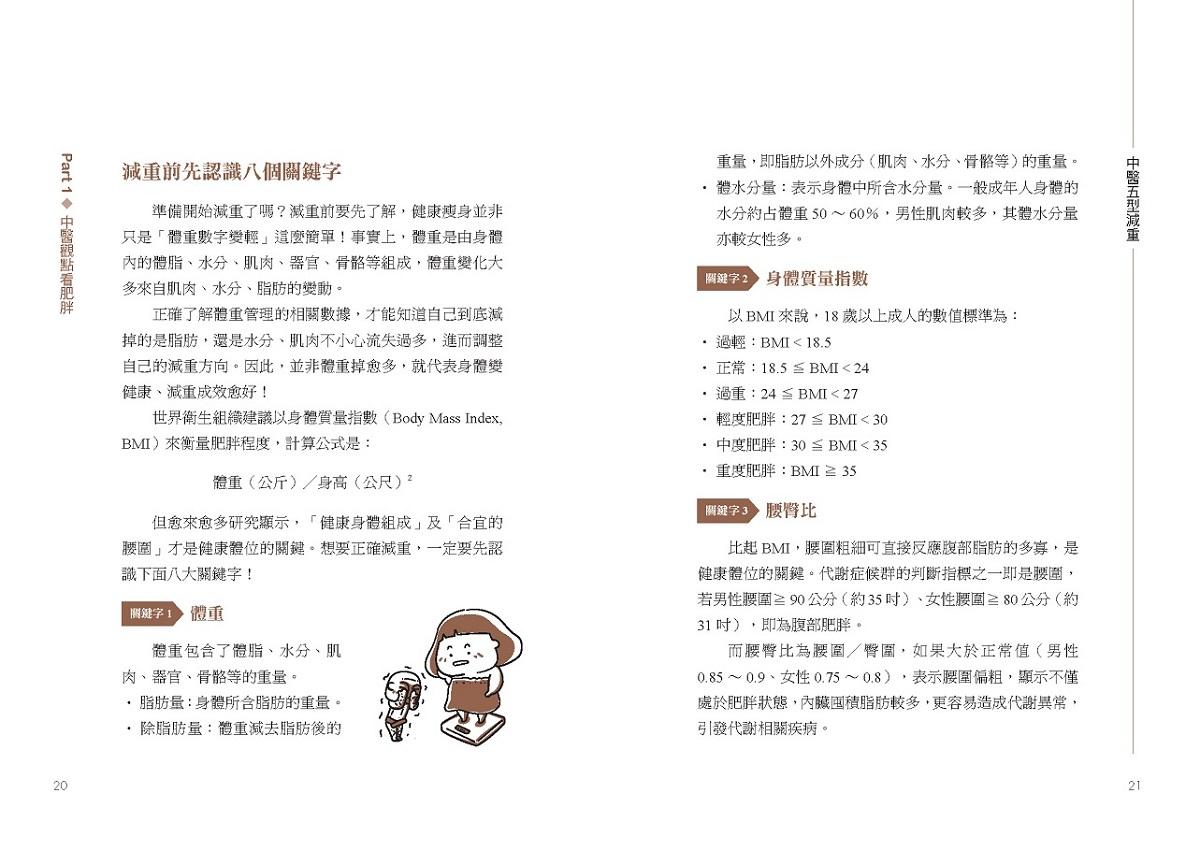 為避免錯誤的減重觀念和迷思,本書從五型檢測開始,讓讀者先初步認識自身體質,並了解每個人的先天條件、後天飲食、生活作息等種種狀態,都是造成肥胖的成因,所以同樣的治療無法適用所有人。