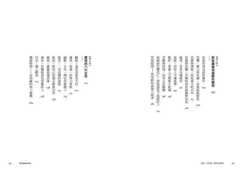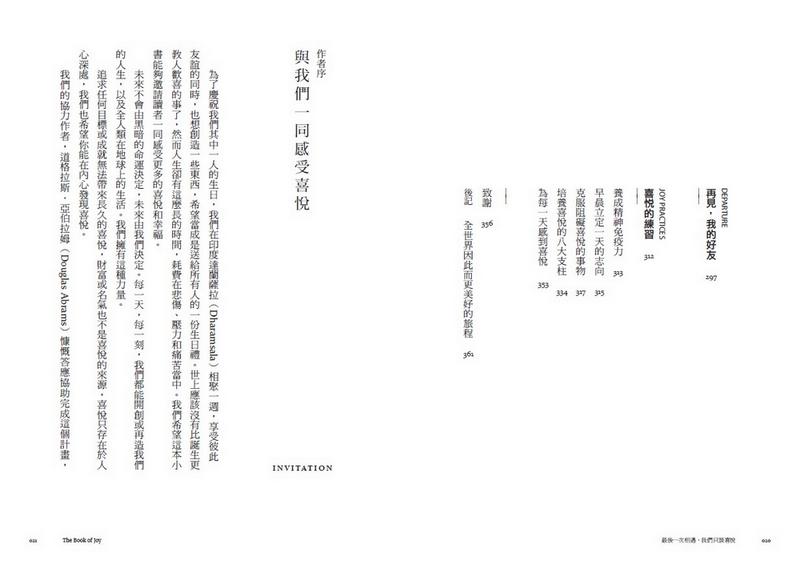 書中除了兩人時而幽默逗趣,時而深刻感動的對談,分享他們對人生的體悟與許多真實故事,也從探討喜悅的本質、結合科學實證分享跨越負面情緒的方法──嫉妒、恐懼、孤獨、焦慮、失去的苦痛等,到獲得喜悅的八大心靈支柱,分享他們穿越苦痛的智慧。同時列出他們日常安頓內心的功課,讓讀者也能練習感受喜悅。