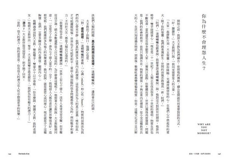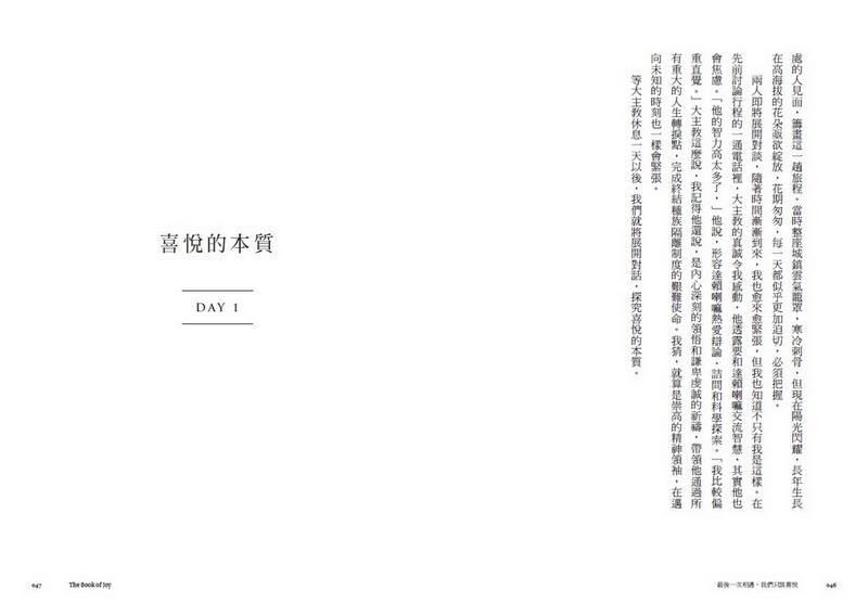 大主教從未自稱聖徒,達賴喇嘛也稱自己只是一介僧侶,他們的人生嚮往,與你我並無不同。兩人的人生看來充滿混亂與苦痛,卻能在其中尋得平靜、勇氣與喜悅。他們說,苦為人所不能免,但我們可以選擇如何面對苦痛,我們都能學會在充滿挫折與苦痛的環境,依然懷抱喜悅而活。