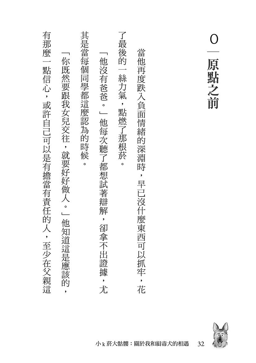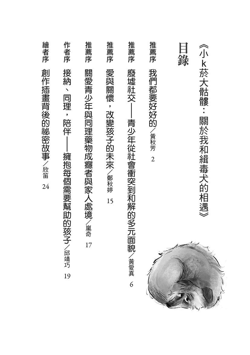 「沒有問題少年,只有少年問題」這句話,不斷出現在我閱讀《小k菸大骷髏:關於我和緝毒犬的相遇》的當下,也在讀每一篇章中浮現多張面孔(曾收容在少年觀護所的青少年),現今社會環境的多元與家庭的結構若不彰,青少年猶如浮萍亦是野草,而同儕間的影響與家庭關係不彰身心容易產生偏差,這時若又接觸到「毒品」更將人生複雜化,因戒毒是一輩子的拔河。我相信大多藥物成癮者是真的想戒毒,但為何卻越陷越深至痛恨到想放棄自我呢?書中提及運毒為籌措父親醫藥費的情節,好似我曾接觸過的一位少年個案,而被標籤化的人等於間接將他們邊緣化了;本書將本應單純卻不單純的青少年問題,用生動的故事連結在一起,非常推薦本書,以期正視陪伴關愛青少年與同理藥物成癮者與家人處遇的重要性。
