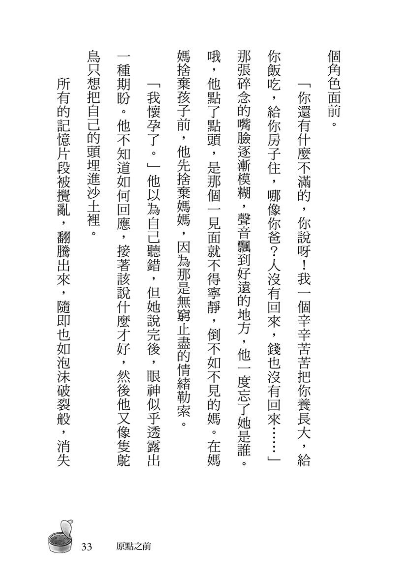 「你還有什麼不滿的,你說呀!我一個辛辛苦苦把你養長大,給你飯吃,給你房子住,哪像你爸?人沒有回來,錢也沒有回來,…」那張碎念的嘴臉逐漸模糊,聲音飄到好遠的地方,他一度忘了她是誰。哦,他點了點頭,是那個一見面就不得寧靜,倒不如不見的媽。在媽媽捨棄孩子前,他先捨棄媽媽,因為那是無窮止盡的情緒勒索。