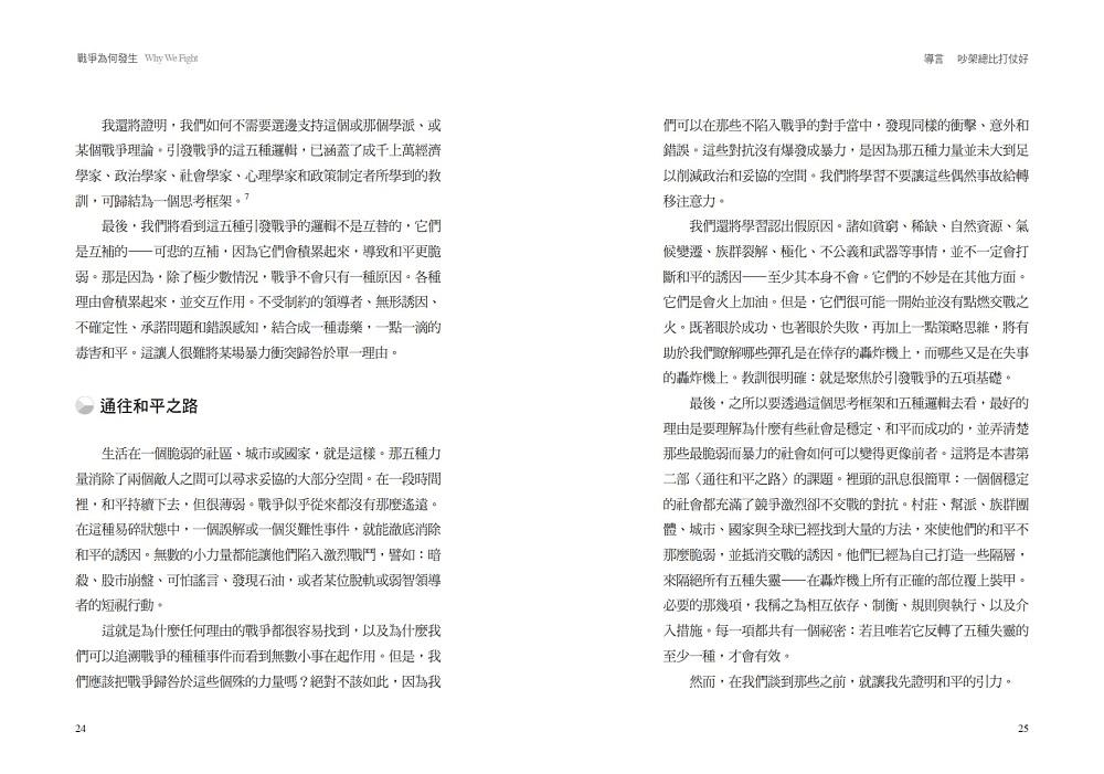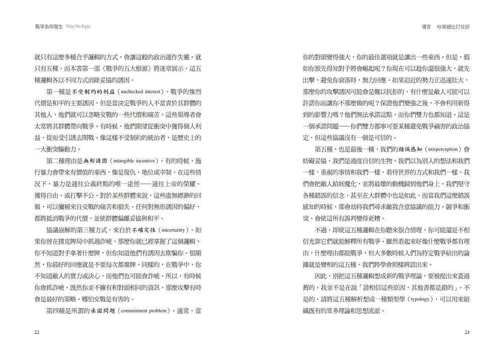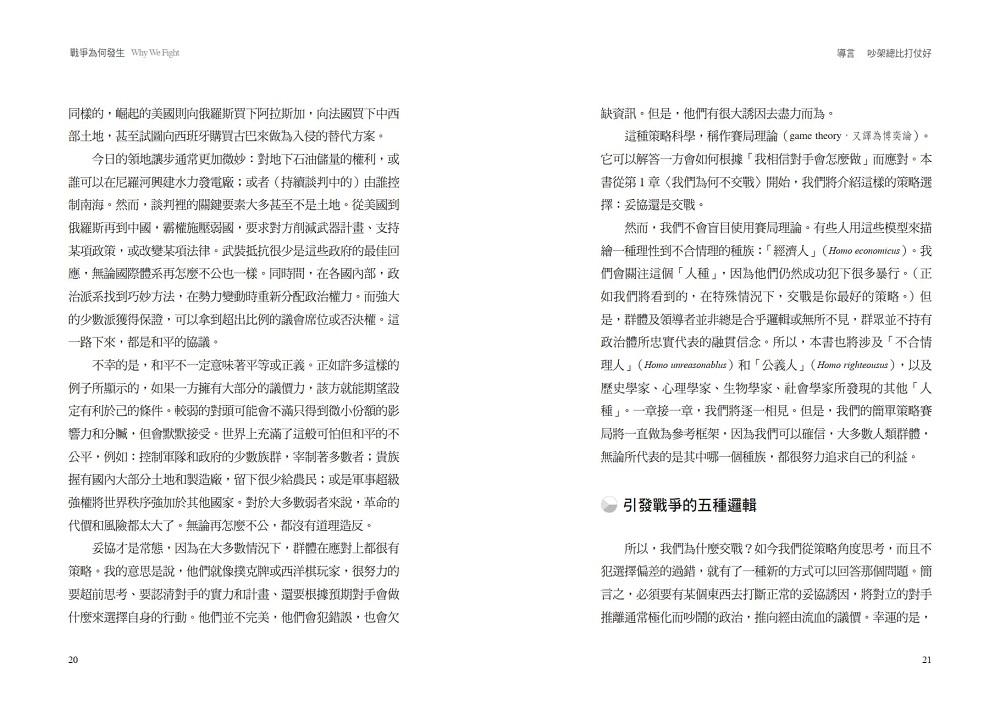 我們為什麼交戰?如今我們從策略角度思考,而且不犯選擇偏差的過錯,就有了一種新的方式可以回答那個問題。簡言之,必須要有某個東西去打斷正常的妥協誘因,將對立的對手推離通常極化而吵鬧的政治,推向經由流血的議價。幸運的是,就只有這麼多種合乎邏輯的方式,會讓這般的政治運作失靈。就只有五種,而本書第一部〈戰爭的根源〉將逐章展示。這五種邏輯各以不同方式消除妥協的誘因。