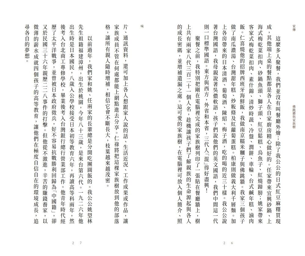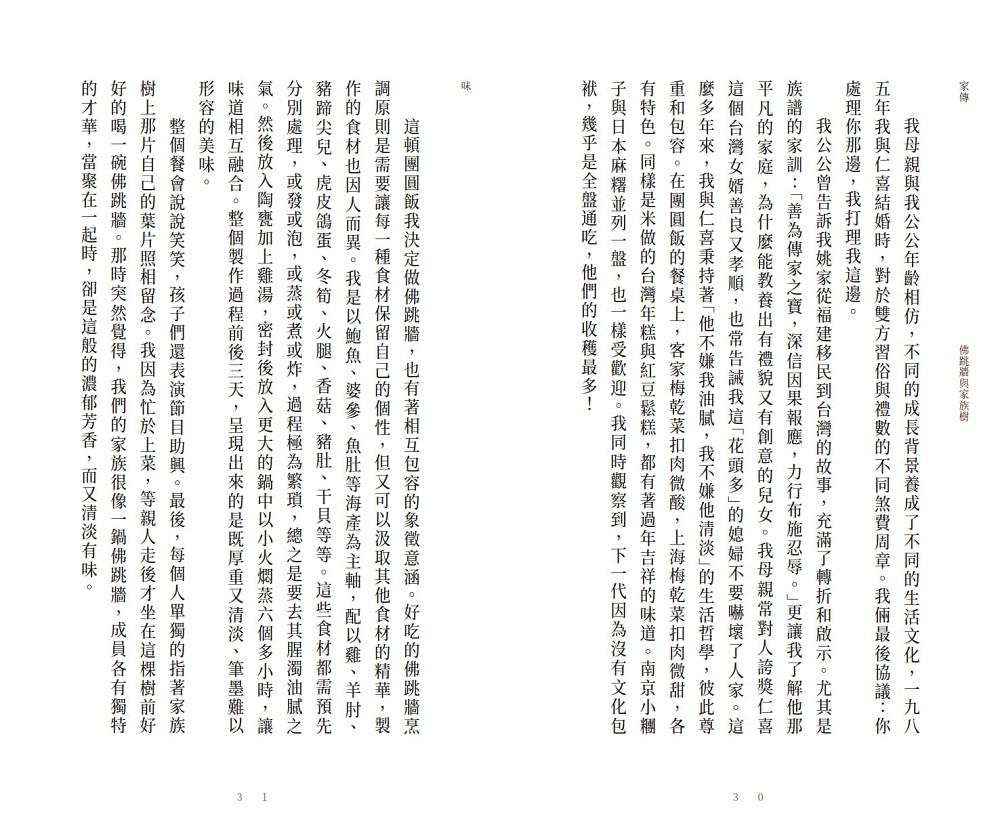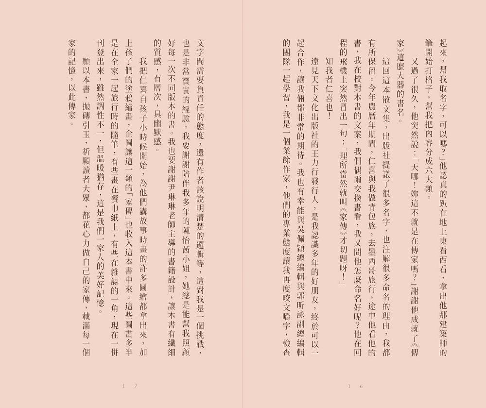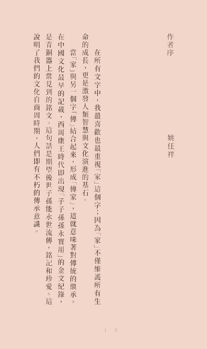 其中,最具獨特性、最帶有作者深厚的情感與生命觀、價值觀的,就是貫穿全書一系列的「心語」。這是作者做為一位深植於中國文化,生活在世紀交替的台灣,親身經歷而且發自內心的關於家庭、親情、歷史、信仰等真實而懇切的感言。我一直認為這些文章是《傳家》中最珍貴的創作,也是一篇篇引人入勝的溫馨散文。遠見天下文化決定將這些文字發行單行本《家傳》,真是一個太好的消息。――姚仁喜建築師