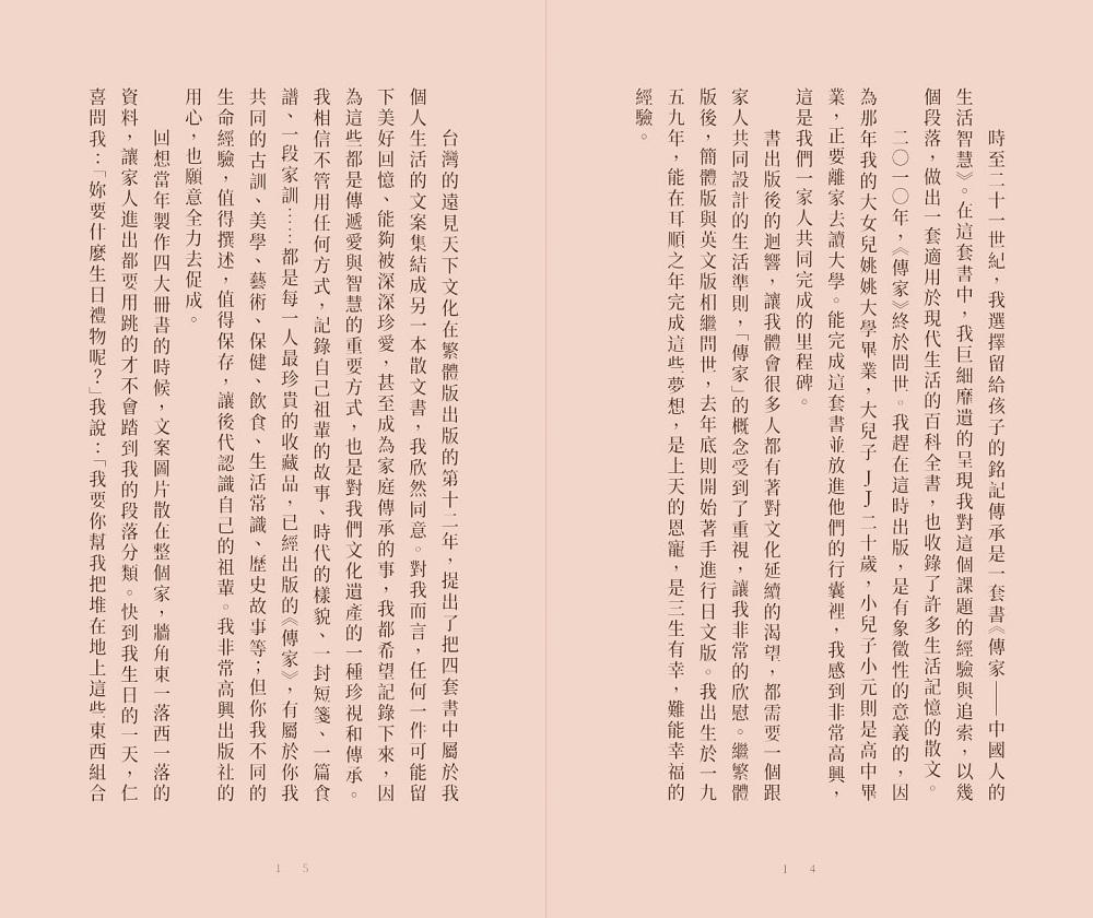 《傳家――中國人的生活智慧》繁體版於2010年問世;在2012年出版了簡體中文版;在2021年出版了英文版行銷全世界;並預定於今年出版日文版。