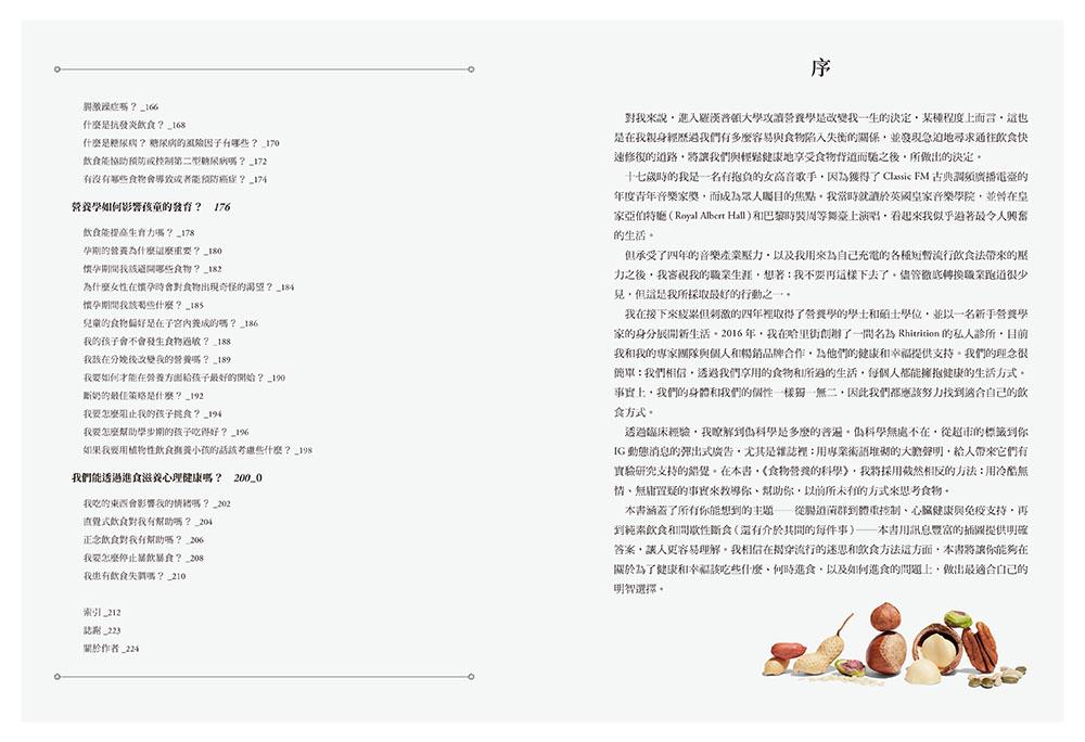 本書涵蓋了所有你能想到的主題——從腸道菌群到體重控制、心臟健康與免疫支持,再到純素飲食和間歇性斷食(還有介於其間的每件事)——本書用訊息豐富的插圖提供明確答案,讓人更容易理解。我相信在揭穿流行的迷思和飲食方法這方面,本書將讓你能夠在為了健康和幸福該吃些什麼、何時進食,以及如何進食的問題上,做出最適合自己的明智選擇。
