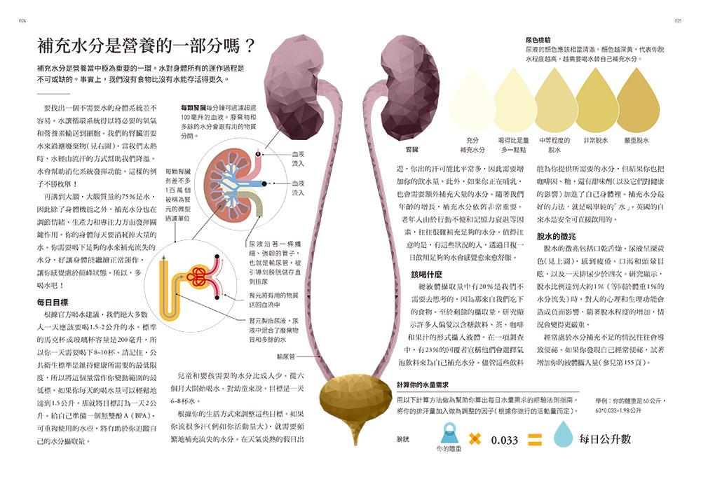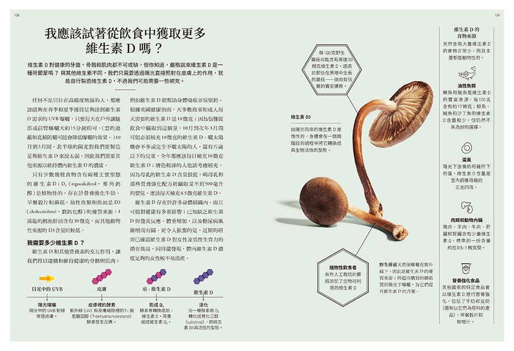 營養不良、永續飲食、發酵、素肉(真菌蛋白)、糞菌移植、人工甜味劑、超級食物、有機認證、目標心率等,在各章節補充說明。112個你最想知道的營養與健康問題,以及無數的營養觀念澄清,本書用最新的科學數據加上高清科普圖片告訴你!