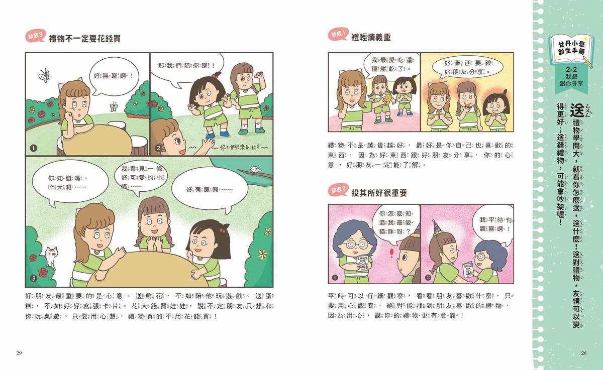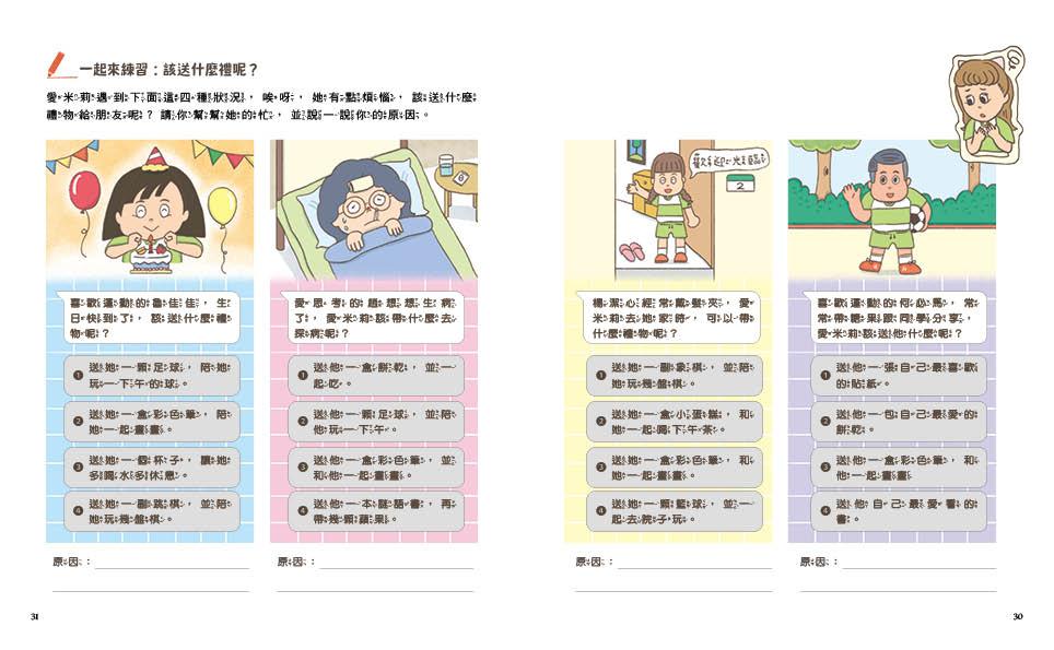 每則故事後,都會有搭配情境練習的新生手冊,小朋友能自己做,也能跟父母一起討論,不管是校園生活的「挑戰」情境,交朋友時的應對場面,讀一讀,想一想,討論一下。讓孩子看故事,吸取經驗;做練習,提升各項能力。