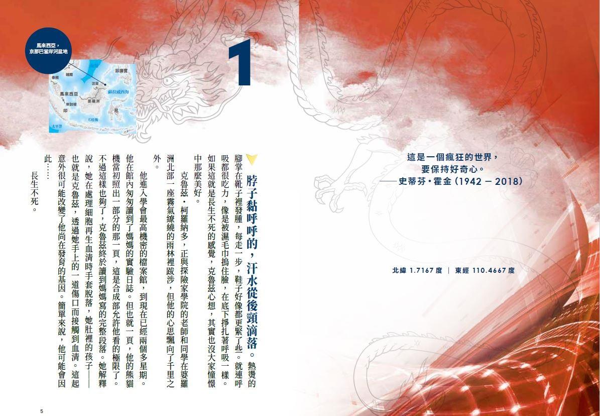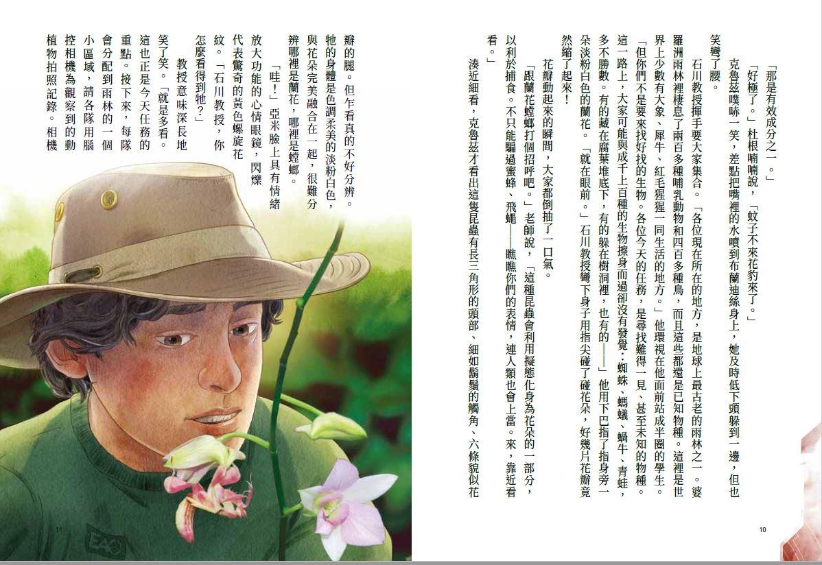 石川教授揮手要大家集合。「各位現在所在的地方,是地球上最古老的雨林之一。婆羅洲雨林裡棲息了兩百多種哺乳動物和四百多種鳥,而且這些都還是已知物種。這裡是世界上少數有大象、犀牛、紅毛猩猩一同生活的地方。」他環視在他面前站成半圈的學生。「但你們不是要來找好找的生物。各位今天的任務,是尋找難得一見、甚至未知的物種。這一路上,大家可能與成千上百種的生物擦身而過卻沒有發覺:蜘蛛、螞蟻、蝸牛、青蛙,多不勝數。有的藏在腐葉堆底下,有的躲在樹洞裡,也有的──」他用下巴指了指身旁一朵淡粉白色的蘭花。「就在眼前。」石川教授彎下身子用指尖碰了碰花朵,好幾片花瓣竟然縮了起來!