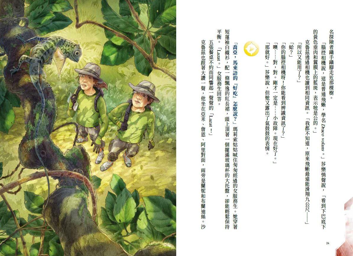 隊伍繼續前進,克魯茲回頭看瑪莉索姑姑粉棕色的狩獵帽在哪裡。他一直走在靠近隊伍前面,姑姑在後面壓陣。找到了──沒錯,她還在後面。這一趟穿越婆羅洲京那巴當岸河盆地的健行,他們所有的老師都來了,克魯茲猜想這代表待會兒會有分組任務。很快就證實他的預感沒錯。他們又走了八百公尺左右,領頭的勒格宏教授在荒草叢生的泥塘邊停下來宣布:「我們先在這裡喝水休息。接下來會宣布今天的任務。」