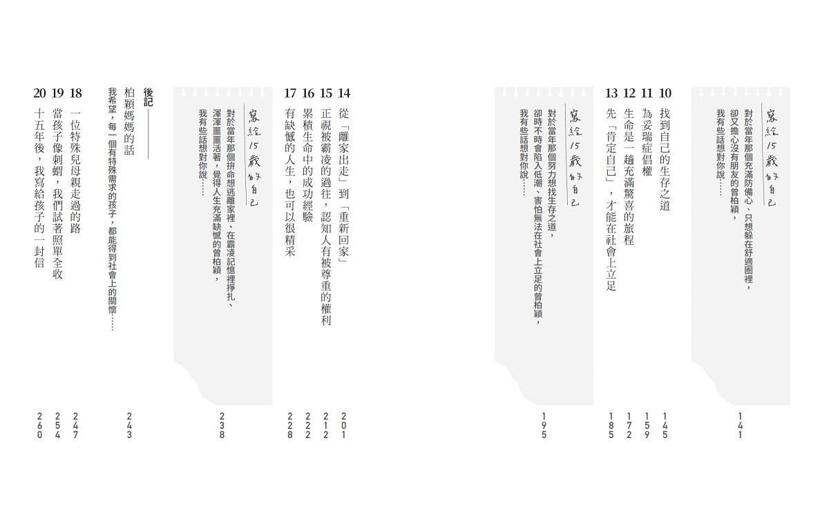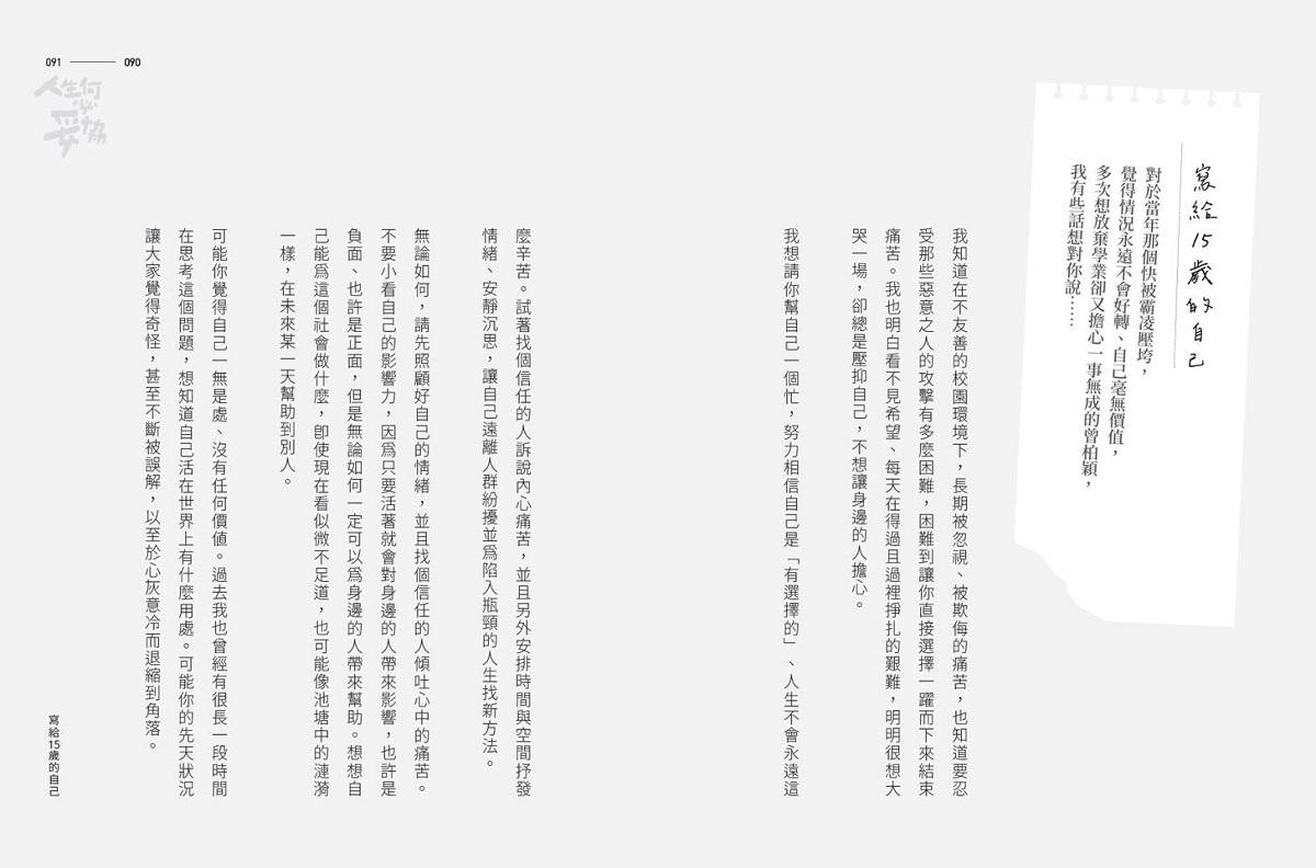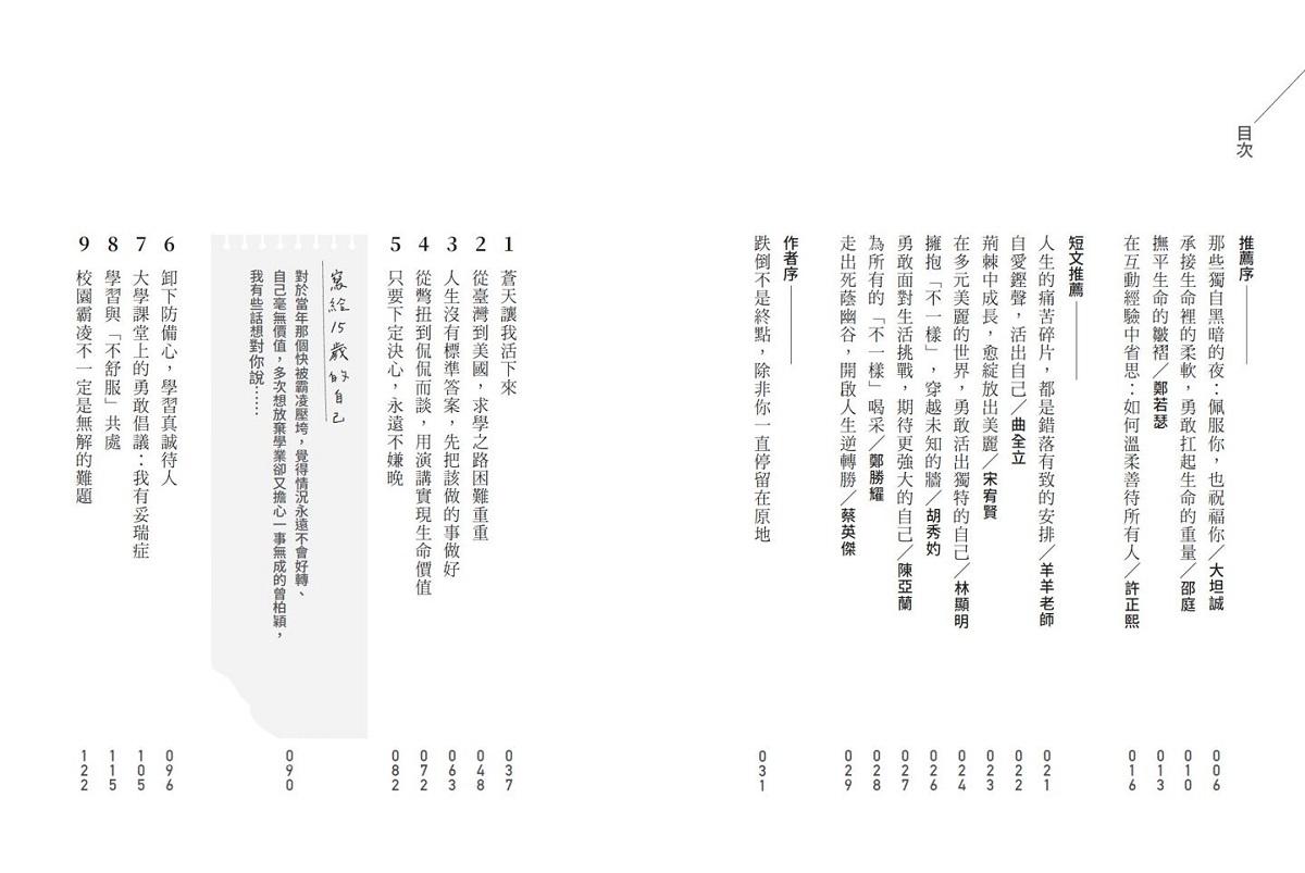 其中,最讓我難忘的一段話,就看得我鼻酸又欽佩:「我想到十五年前的自己,會為了討好別人而做出自己不喜歡的事,為的只是換到那麼一點點友情,現在的我絕對不會這麼做。」