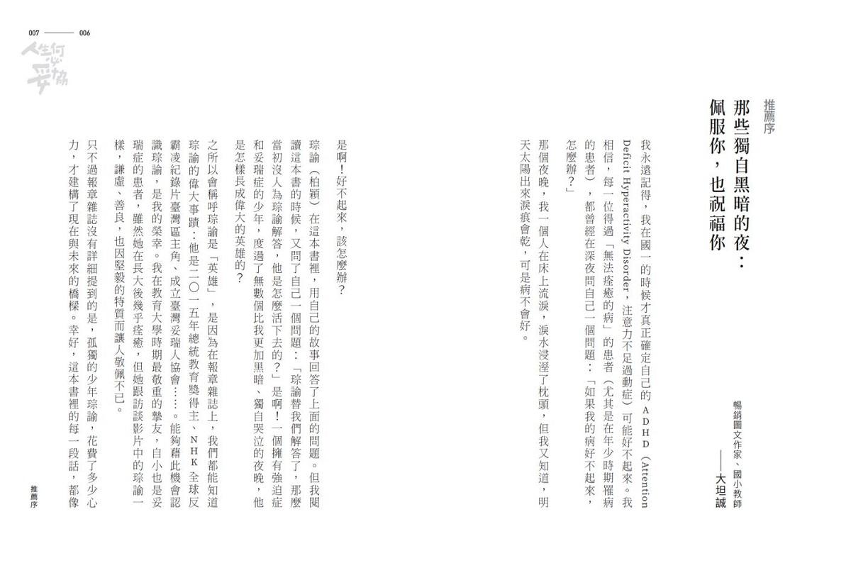 琮諭(柏穎)在這本書裡,用自己的故事回答了上面的問題。但我閱讀這本書的時候,又問了自己一個問題:「琮諭替我們解答了,那麼當初沒人為琮諭解答,他是怎麼活下去的?」是啊!一個擁有強迫症和妥瑞症的少年,度過了無數個比我還更加黑暗的、獨自哭泣的夜晚,是怎樣長成偉大的英雄的?