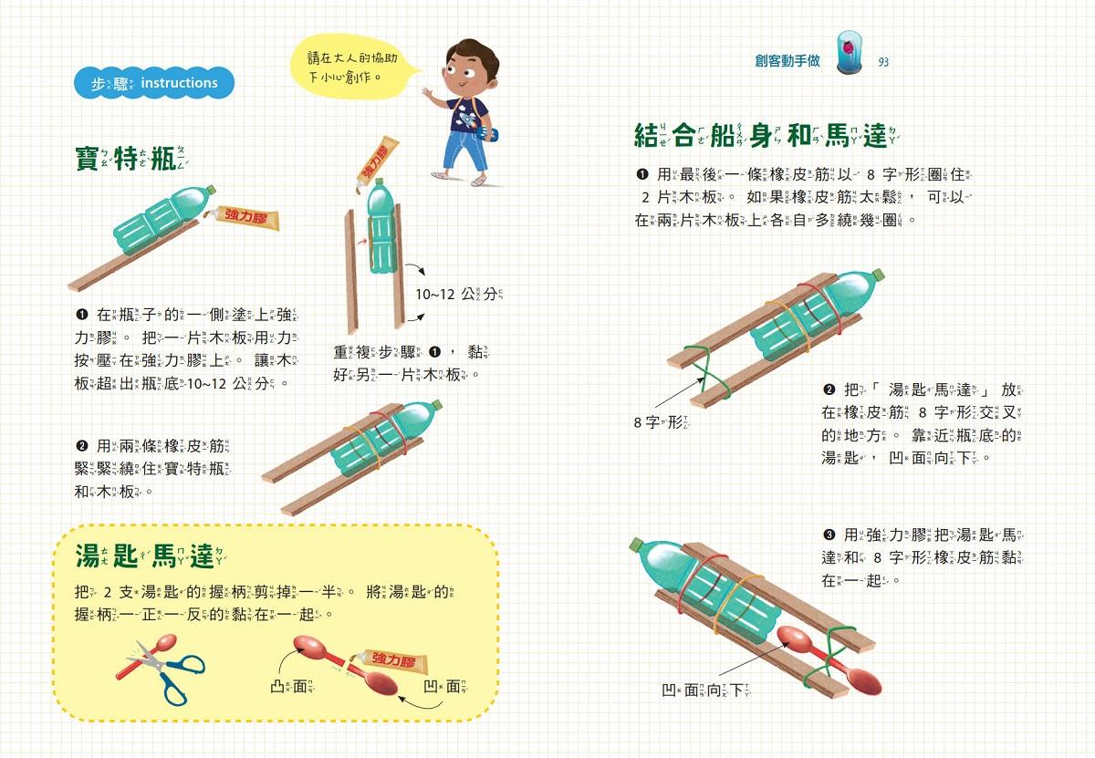 本系列的另一個特色是「創客動手做」。精選與故事相關的活動,完成從無到有的趣味實驗。這些活動大多取材簡單,讀者們讀完故事之後,不妨找來實驗的材料,動手做做看。這就是創客的精神,從做中學,會有更深的體會喔!