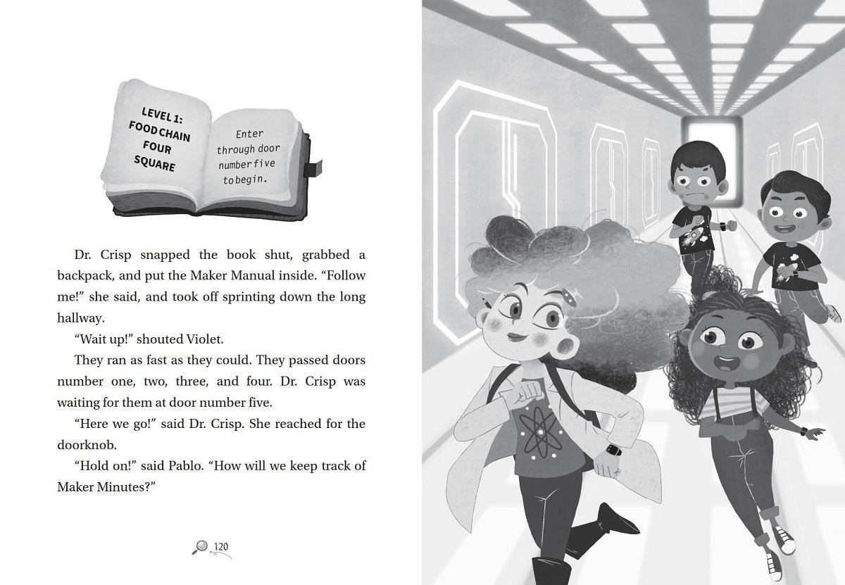 說到創客迷宮,真是創客夥伴夢寐以求的樂園。有創客手冊、創客手錶等輔助道具,還有全像投影等高科技產品幫助學習。帕博和小紫必須在規定的時間內完成任務,否則就失去再度進入創客迷宮的資格。完成任務的過程高潮迭起,讀者一定也迫不及待的參與答題,無形之中就吸收了書中傳達的科學知識。