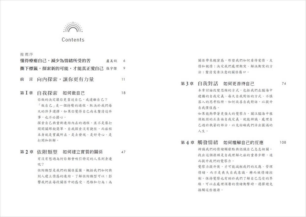 在本書中,你可望找到更有意義的東西。你可以踏上自我發現的旅程、撕下一張張標籤、進而探索自我;你也有機會遠離社群媒體的喧囂,產生自我療癒的人生洞見。本書的內容豐富,而且易於理解、資訊量適中。你可以隨意跳著翻閱,或按照章節順序讀完。說不定,你會發覺裡頭的觀念和構想帶來洞見、安心、寬慰與支持。