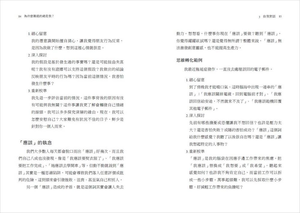 我最喜歡書如其英文書名之處,有許多五分鐘小練習。可不要小看這些練習!我在閱讀的過程中試了幾個在自己和個案身上,不試不知道,一試成主顧啊!