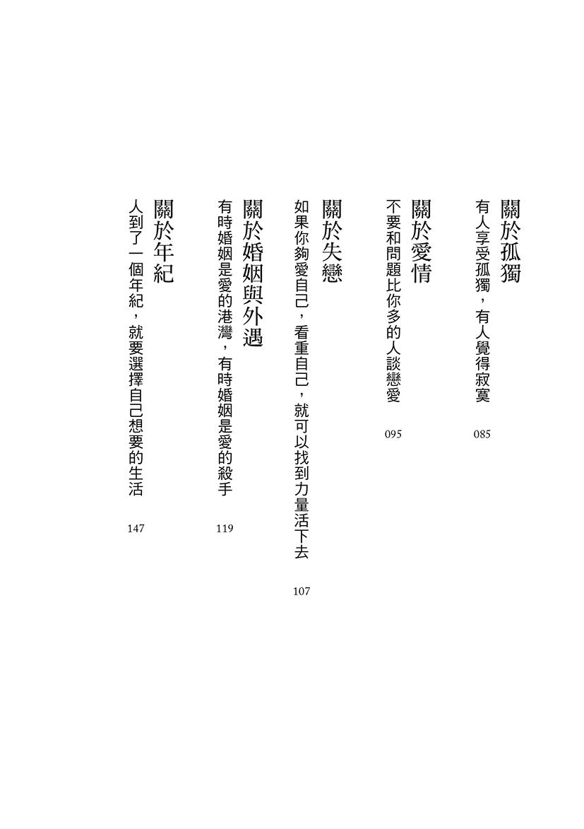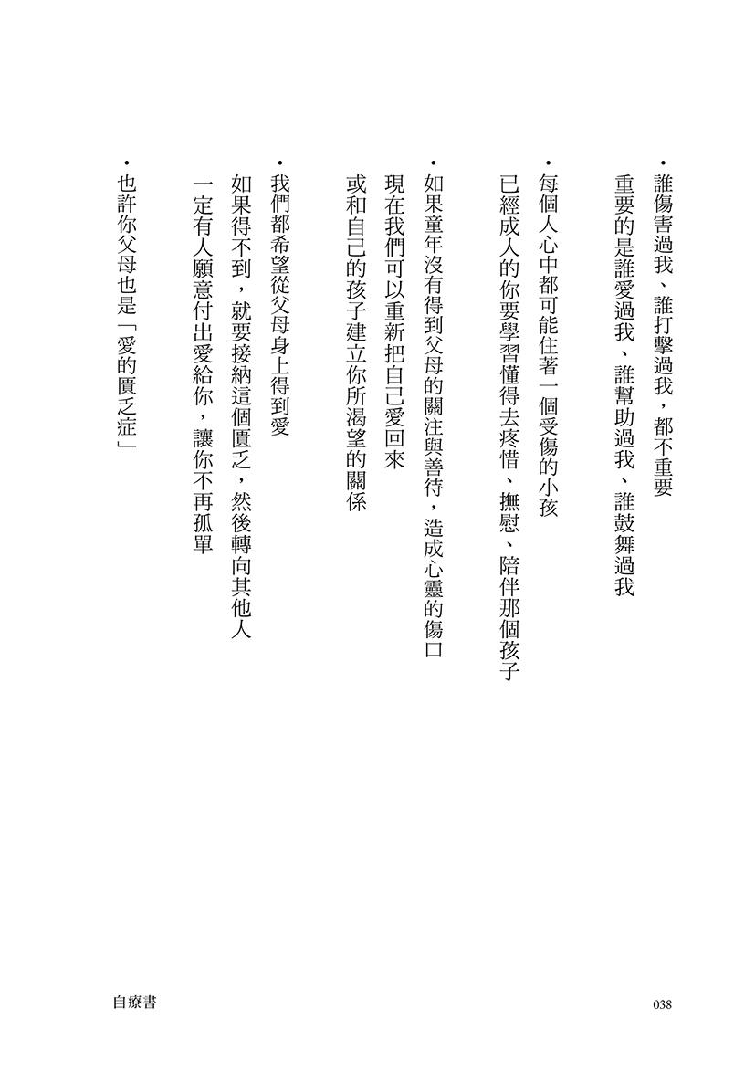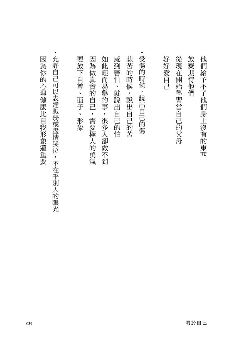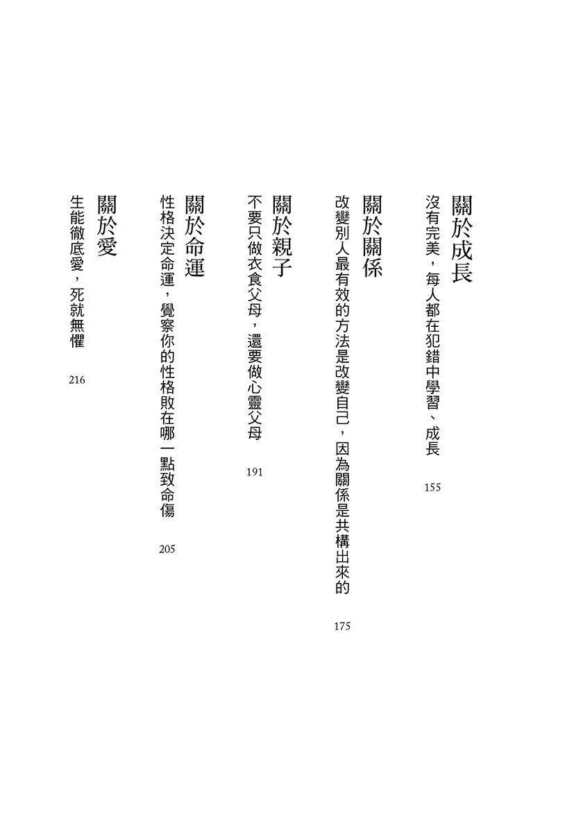 書中共有十五個主題,每個人都能在各自的主題當中找到療癒的指引,因為每一金句,都是作者從自己和學員的生命中淬煉而來,如此地貼近現實、貼近我們的心。