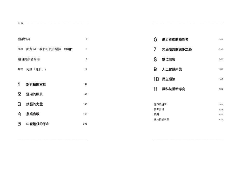 透過書中這趟令人驚心動魄的旅程,帶領我們探訪從過去到未來、從新石器時代的農業革命到AI崛起的科技發展史。全書以一條強力主線貫串全局:科技的變革不是命中註定,科技的發展方向也絕非無法改變。儘管人類的制度並不完美,各種衝動也常相互矛盾,但人類仍然掌握主控權,我們有責任決定自己所造的這輛車要駛向正義或是墜落懸崖。在這個自動化高速發展、錢與權的壟斷似乎勢不可當的時代,本書適時敲響警鐘,提醒人類有能力、也必須奪回控制權!──阿比吉特.班納吉(Abhijit Banerjee)、艾絲特.杜芙若(Esther Duflo),2019年諾貝爾經濟學獎得主,《窮人的經濟學》與《艱困時代的經濟學思考》作者