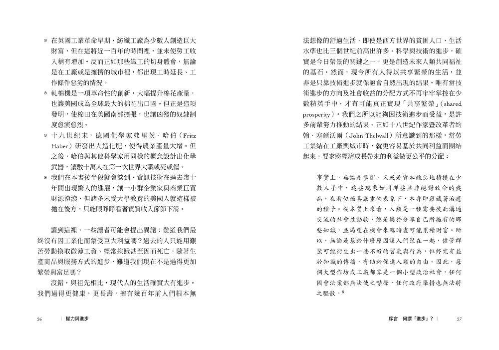 沒錯,與祖先相比,現代人的生活確實大有進步。我們過得更健康、更長壽,擁有幾百年前人們根本無法想像的舒適生活,即使是西方世界的貧困人口,生活水準也比三個世紀前高出許多。科學與技術的進步,確實是今日榮景的關鍵之一,更是創造未來人類共同福祉的基石。然而,現今所有人得以共享繁榮的生活,並非是只靠技術進步就保證會自然出現的結果。唯有當技術進步的方向及社會收益的分配方式不再牢牢掌控在少數精英手中,才有可能真正實現「共享繁榮」(shared prosperity)。我們之所以能夠因技術進步而受益,是許多前輩努力推動的結果。正如十八世紀作家暨改革者約翰.塞爾沃爾(John Thelwall)所意識到的那樣,當勞工集結在工廠與城市時,就更容易基於共同利益而團結起來,要求將經濟成長帶來的利益做更公平的分配: