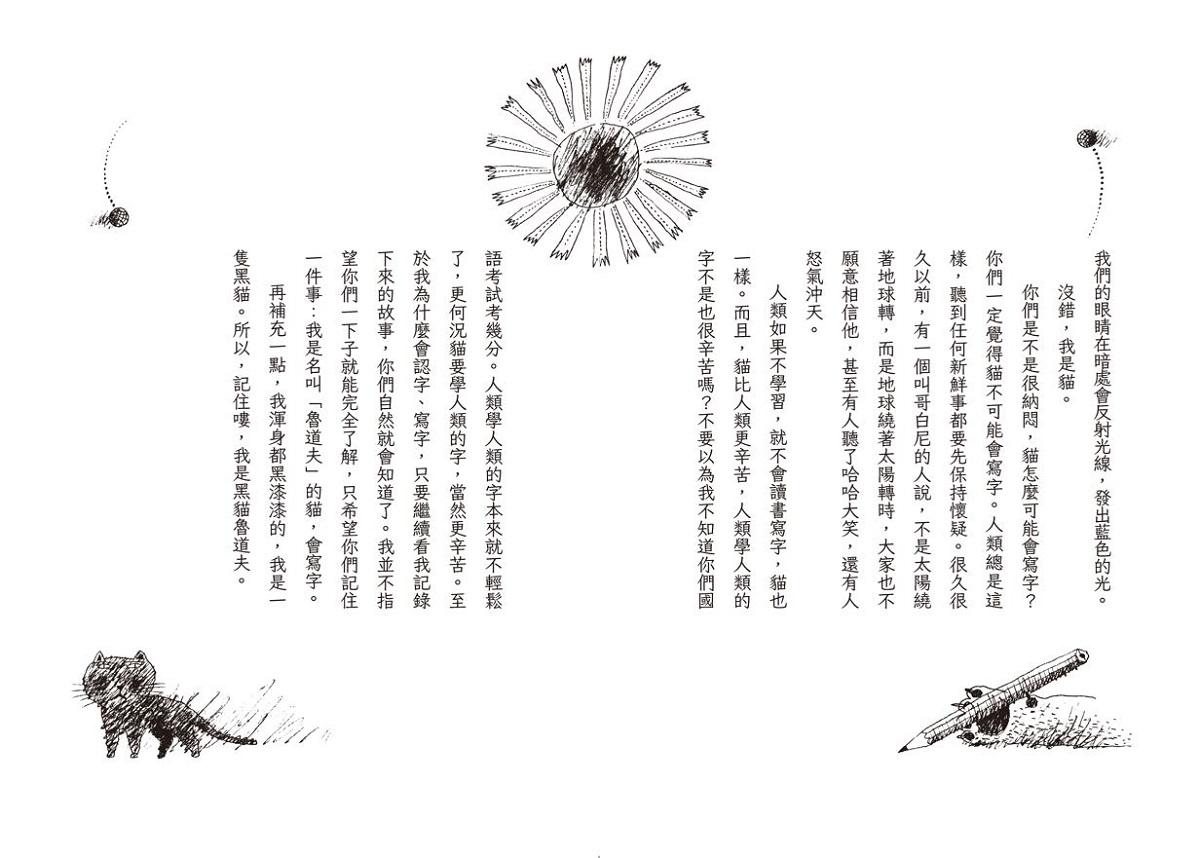 不要以為我不知道你們國語考試考幾分。人類學人類的字本來就不輕鬆了,更何況貓要學人類的字,當然更辛苦。至於我為什麼會認字、寫字,只要繼續看我記錄下來的故事,你們自然就會知道了。我並不指望你們一下子就能完全了解,只希望你們記住一件事:我是名叫﹁魯道夫﹂的貓,會寫字。再補充一點,我渾身都黑漆漆的, 我是一隻黑貓。所以, 記住囉,我是黑貓魯道夫。
