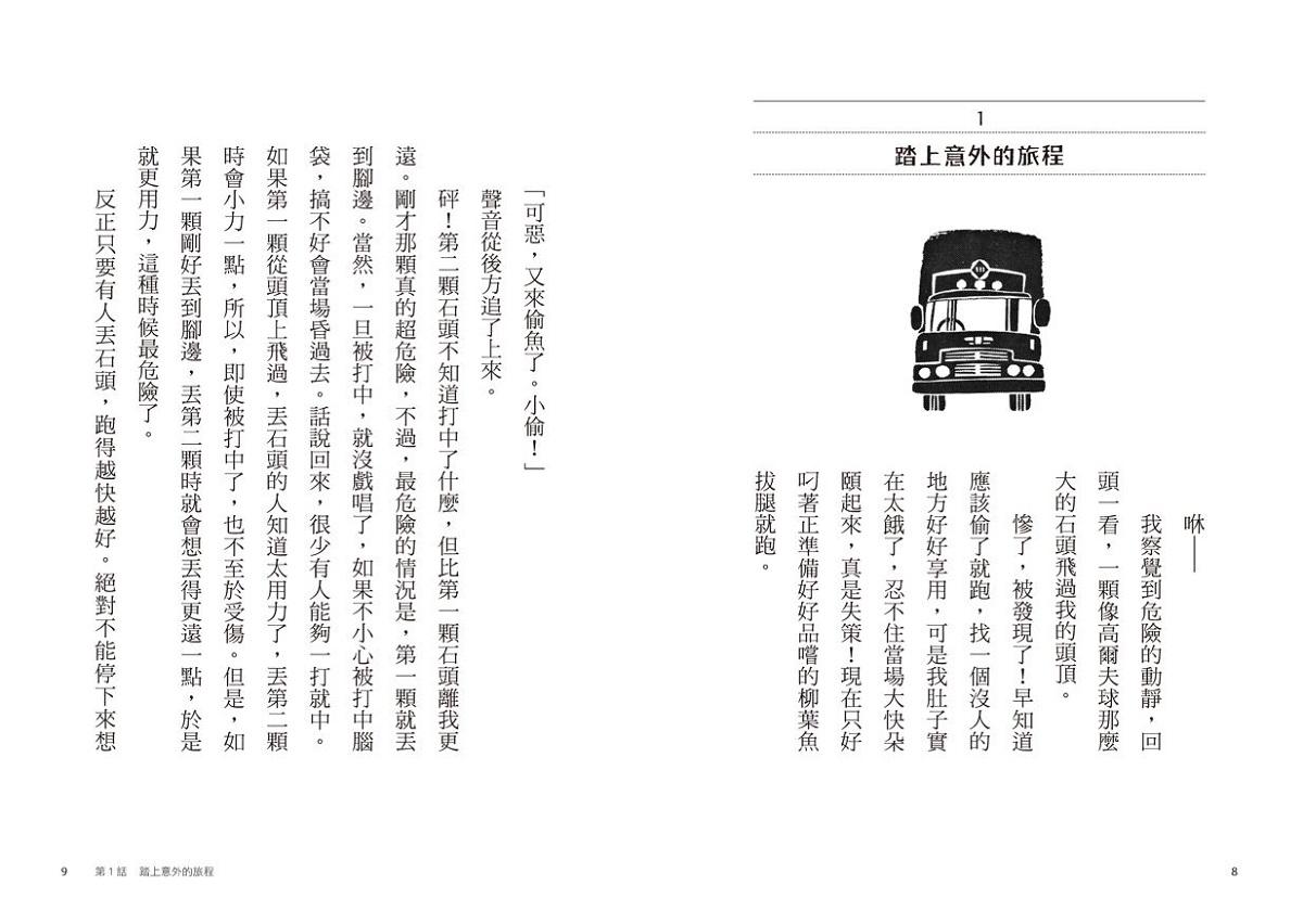 抬頭一看,發現離魚店不遠的地方停了一輛有車篷的大貨車。司機打開駕駛座旁的門坐上車,正準備開走。車篷後方微微掀起一小塊,可以從那裡跳上車。我不顧一切的衝向貨車。魚店老闆舉著拖把,腳上的長筒膠鞋嘎滋嘎滋響著,嘴裡不知道鬼叫著什麼,噴著口水,一路追過來,不想讓我的計謀得逞。