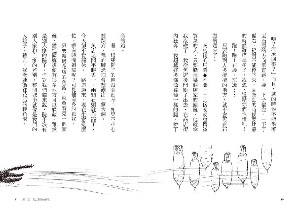只要轉過花店的角落,就會看見一個圍籬,鑽進圍籬後便有很多地方可以躲藏。雖然是別人家的院子,但對我們貓來說,沒有別人家院子和自家院子的差別,整個城市就像是我們的大院子。總之,我全速衝往花店的轉角處。