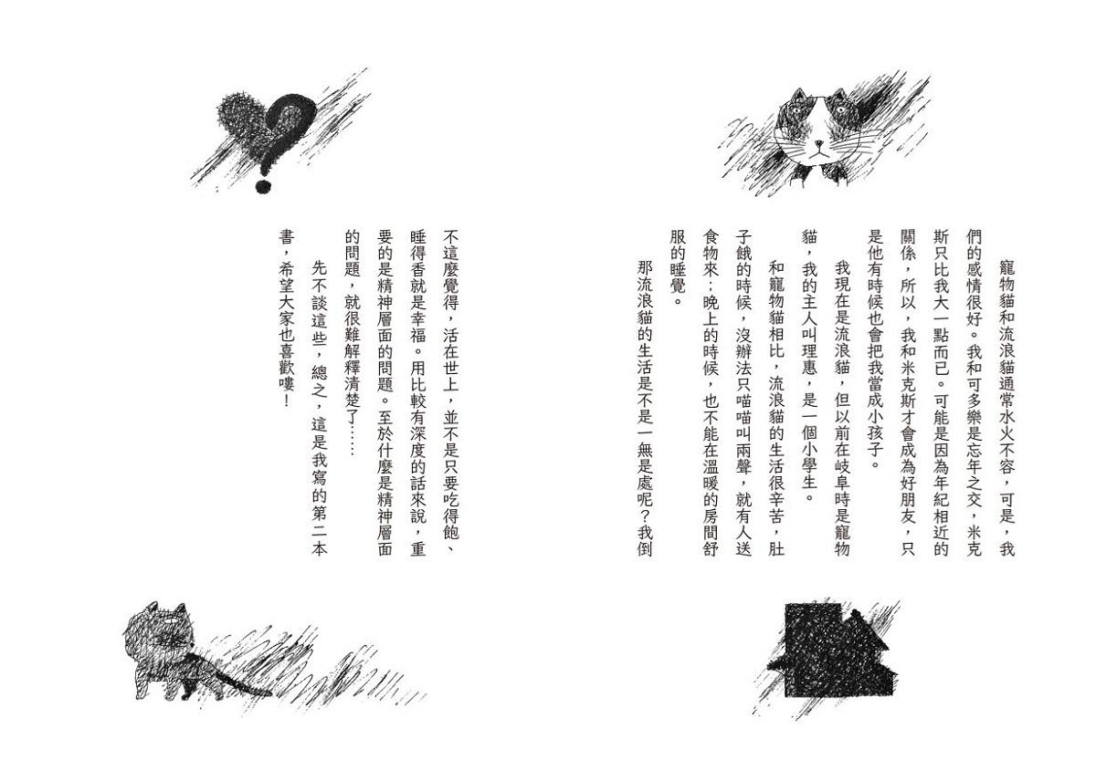 我的書名訂為《街貓一年》,顧名思義所欲書寫的對象是那些「世代生養在街頭」,或如本書的黑貓魯道夫「曾在人族家庭待過卻因故走失,並在殘酷大街討生活」的貓族們。