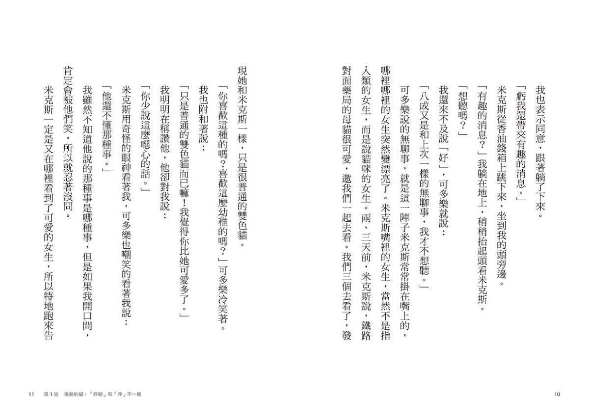 雖然「哼嗯」和「哼」聽起來很像,但意思完全不一樣。我是因為感到佩服而發出那個聲音,但可多樂的「哼」,意思卻沒有那麼單純。既不是生氣,也不是不屑,而是更加複雜。因為可多樂本來就是一隻心思複雜的貓。