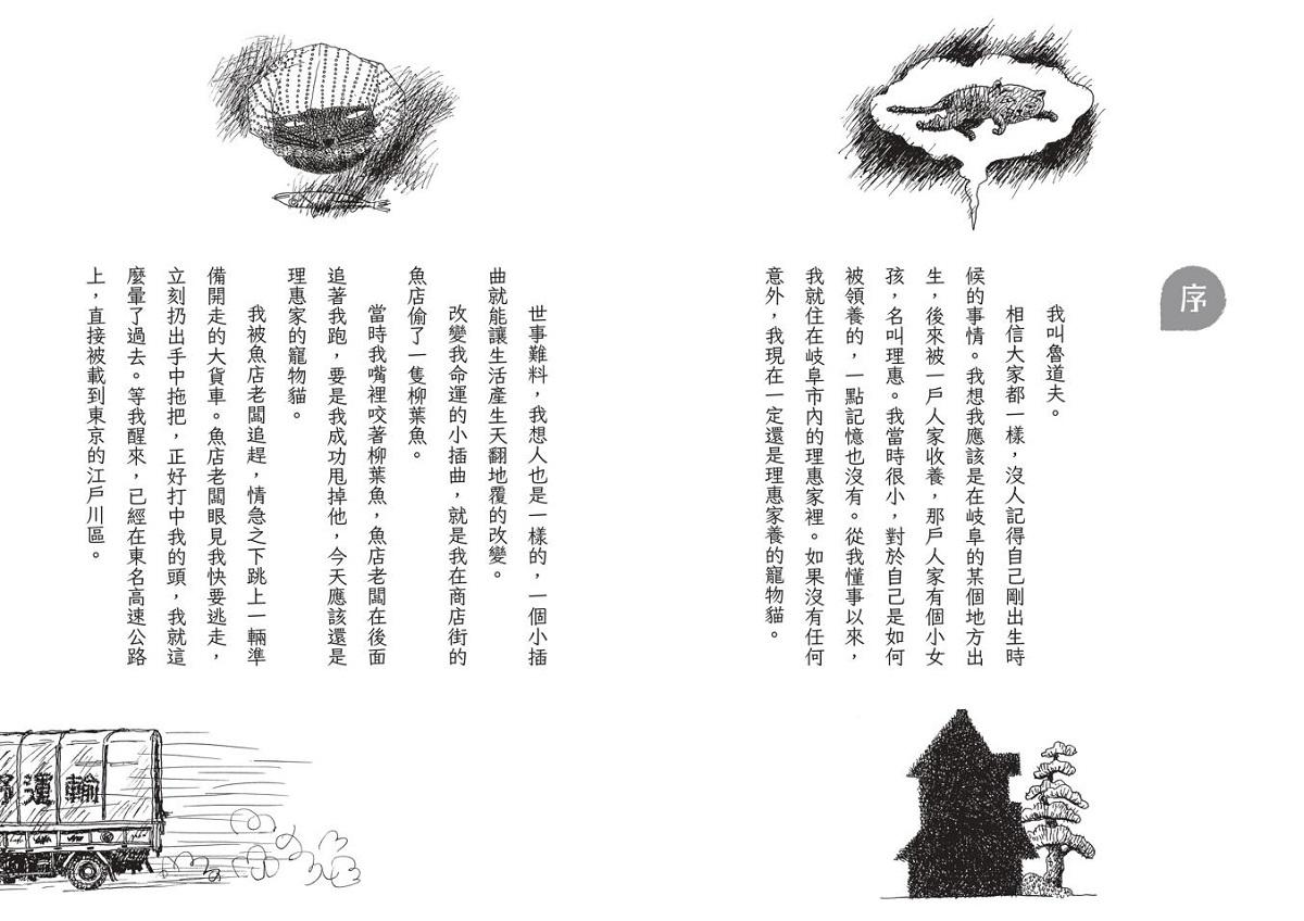 我想我應該是在岐阜的某個地方出生的。後來被一戶人家收養,那戶人家有個小女孩,名叫理惠。我當時很小,對於自己如何被領養的,一點記憶也沒有。從我懂事以來,我就住在岐阜市內理惠的家裡。如果沒有任何意外,我現在一定還是理惠家養的寵物貓。