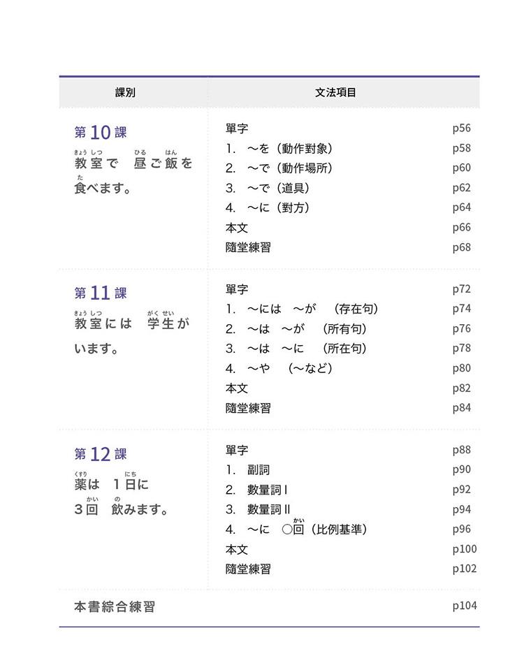 本系列分為「初級」、「進階」、「中級」三個等級,每個等級由4冊構成,每冊6課、每課4個句型。但不包含平假名、片假名等發音部分的指導。完成「初級1」至「初級4」課程,約莫等同於日本語能力試驗N5程度。