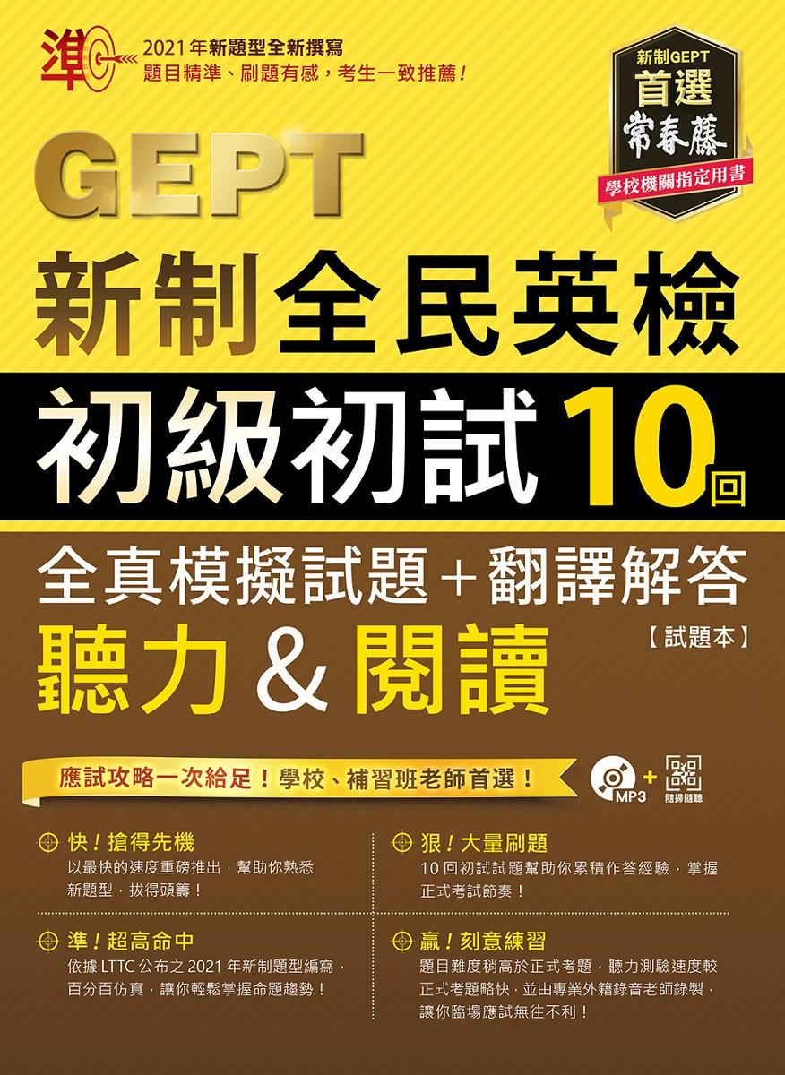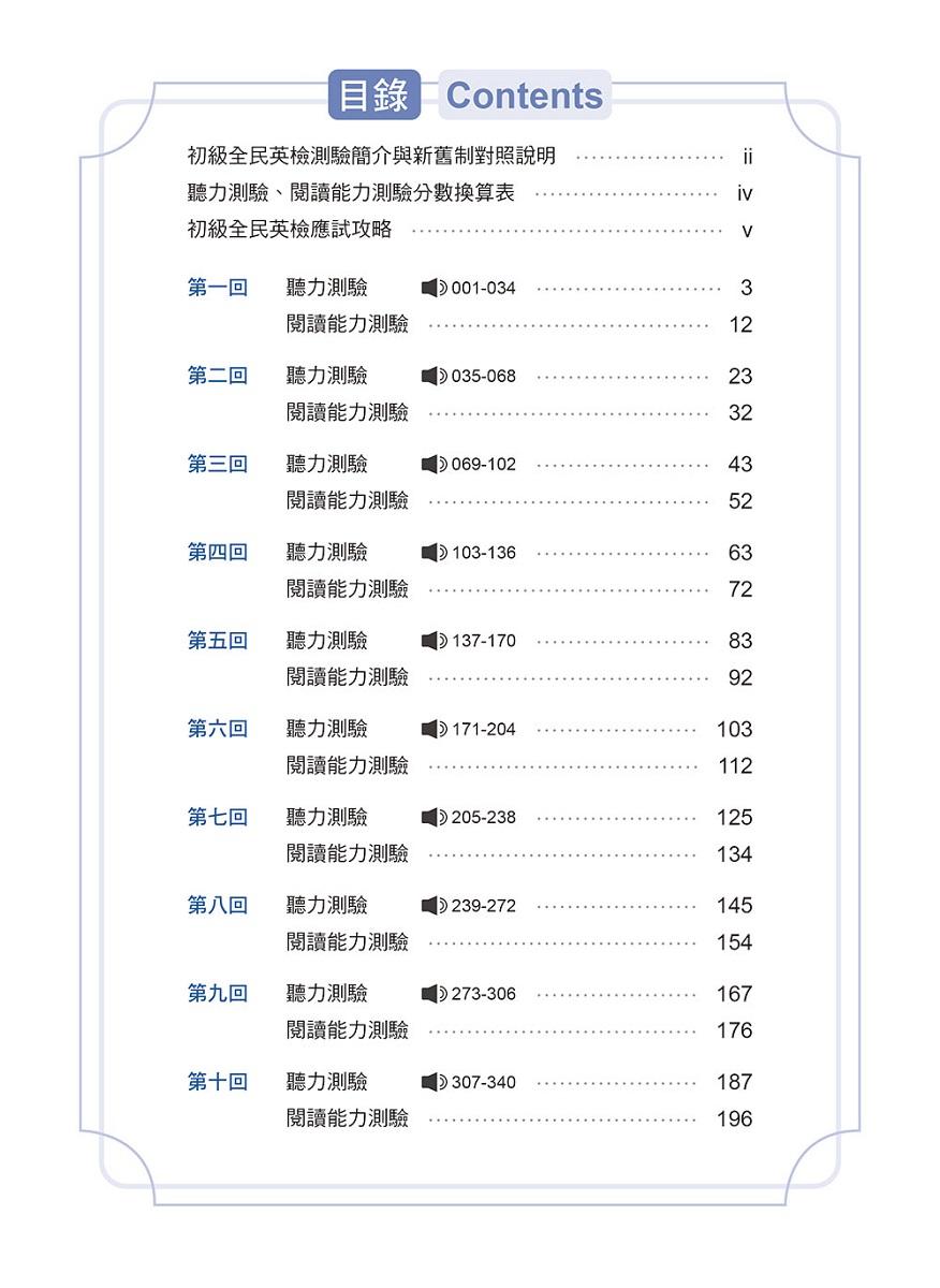 為因應此次改版,本公司亦在第一時間掌握由財團法人語言訓練測驗中心(LTTC)頒布的最新考題,經中外編輯多次研擬、網羅各種新鮮題材,最終完成這本完全仿真的《準! GEPT 新制全民英檢初級初試 10 回全真模擬試題 + 翻譯解答(聽力&閱讀)》。為讓讀者能快速熟悉新制全民英檢考試方向、增進應考實力,我們亦在試題本內提供「應試攻略」,為讀者深度剖析新制題型的出題脈絡並分享解題技巧,且此套書的難易度故意設定為比實際考試再難一點。同時為了不方便使用光碟放音機的讀者,我們貼心地將音檔上傳雲端,只需掃描 QR Code 便能進行測試。各位讀者若能善用此套書,相信必能全面「贏」戰新制考題,更能在初級測驗中「初」類拔萃、勇奪高分!祝大家學習愉快!