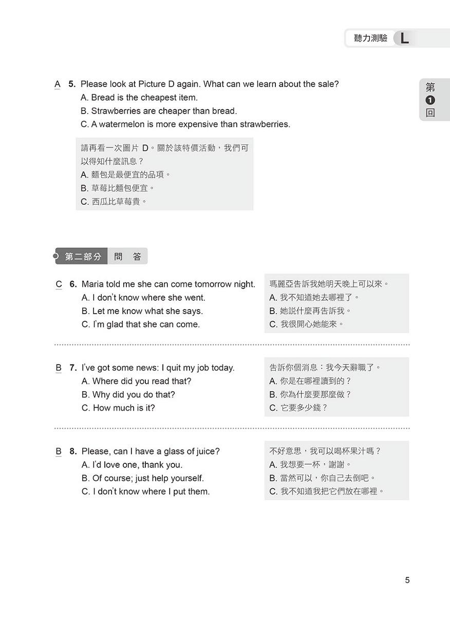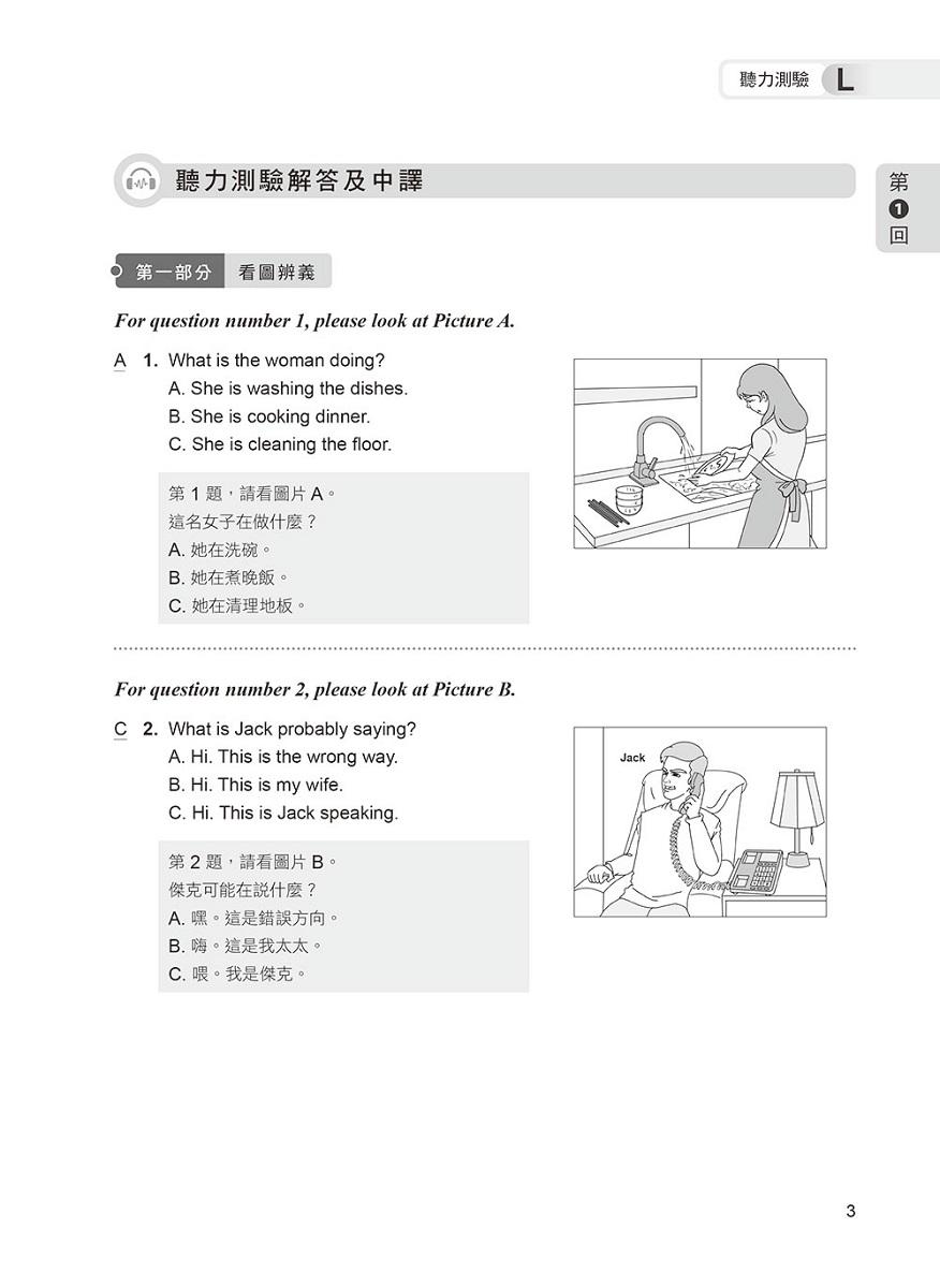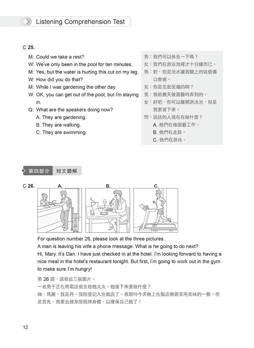 題目難度稍高於正式考題,聽力測驗速度較正式考題略快,並由專業外籍錄音老師錄製,讓你臨場應試無往不利!