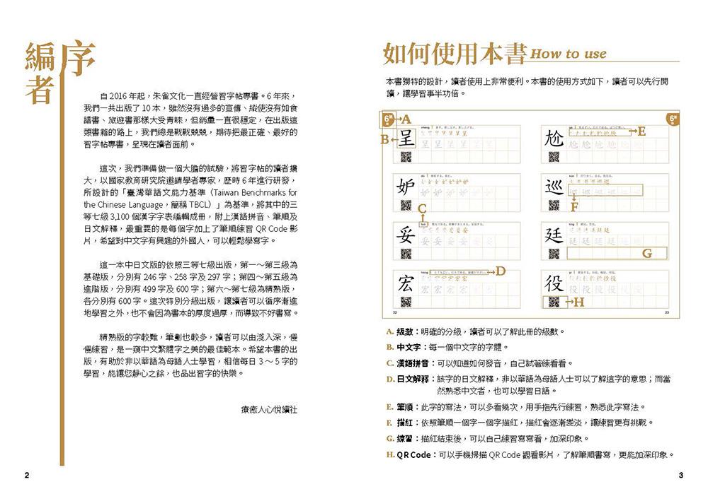本書依「國家教育研究院」建置之臺灣華語文能力基準(TBCL)包括:聽、說、讀、寫、譯三等七級能力指標為基礎,其中「寫」之部分最為困難,因此,本書特別將每個字附上漢語拼音、日文解釋和完整筆順,最重要的是每個字加上了筆順練習QR Code影片,解決外國人學習寫字的困擾。除此之外,還附上練字基本工的基礎內容,是本適合學習繁體中文字初入門的好幫手。