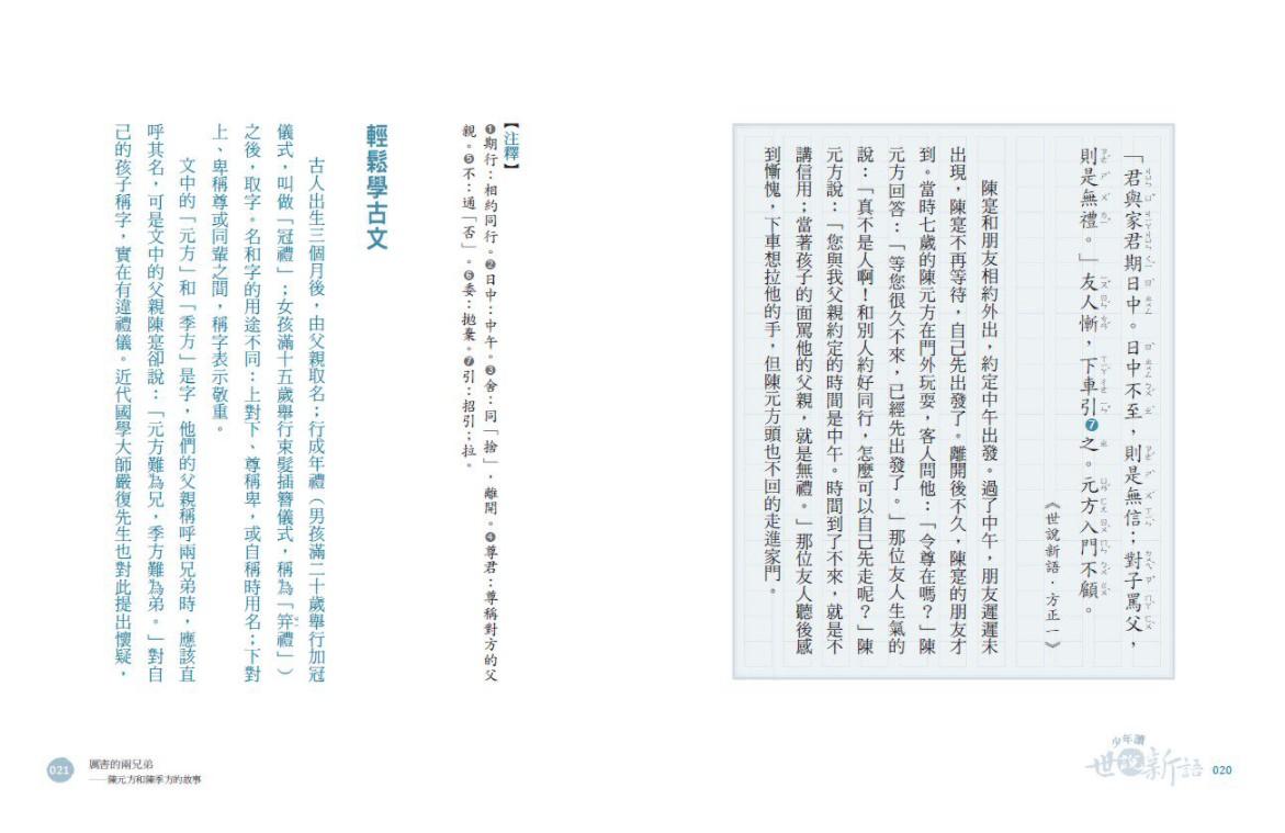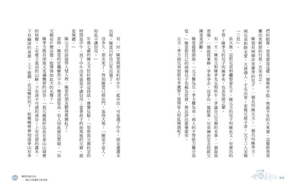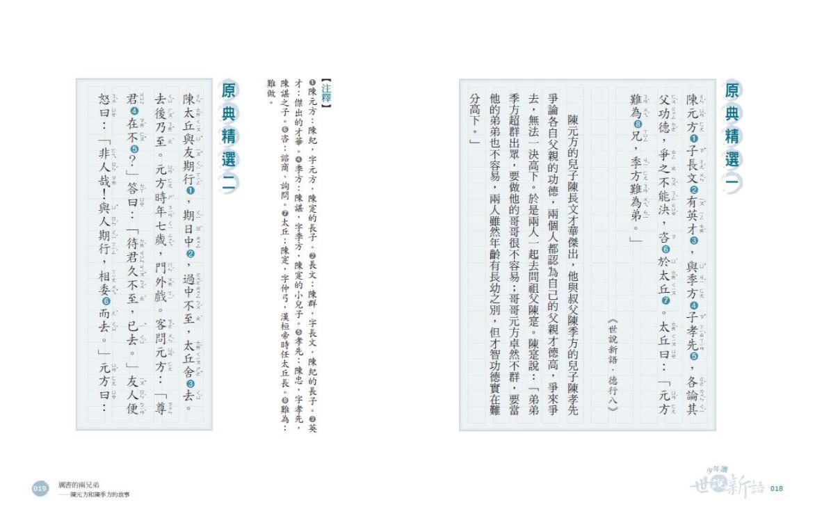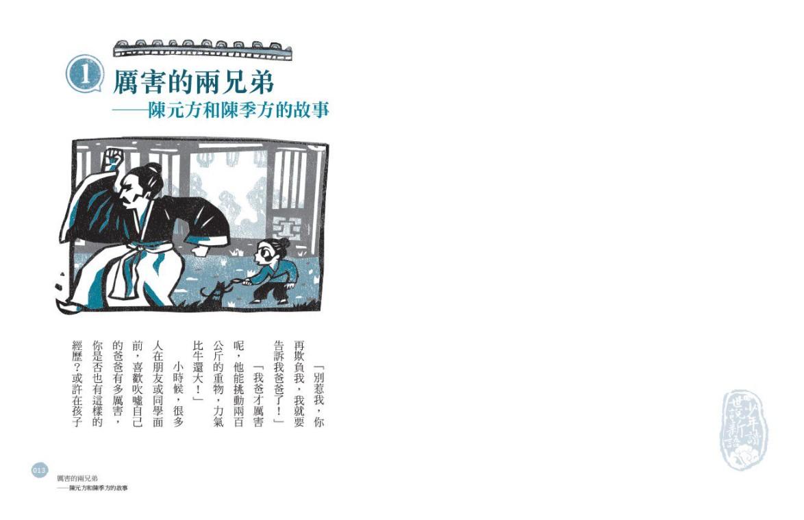《少年讀世說新語1:亂世中的堅持》、《少年讀世說新語2:人性中的至情》與《少年讀世說新語3:思潮下的智慧》,帶著孩子打開學習國學的一扇窗,合計九十篇。