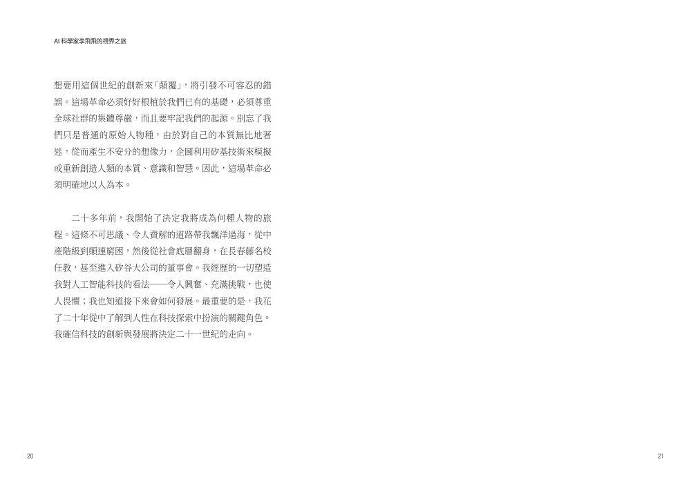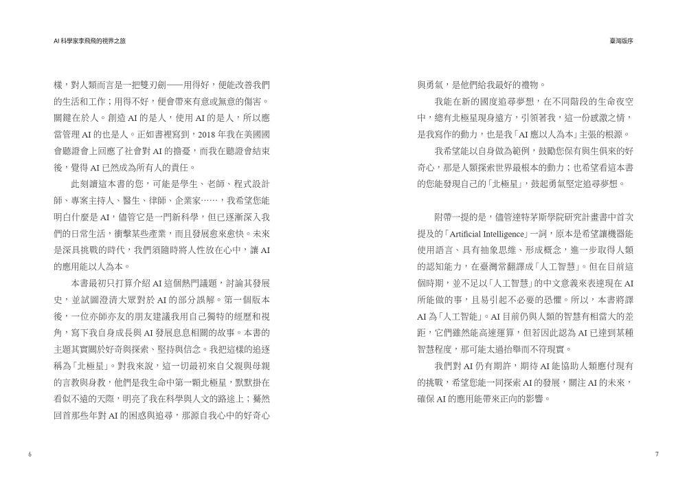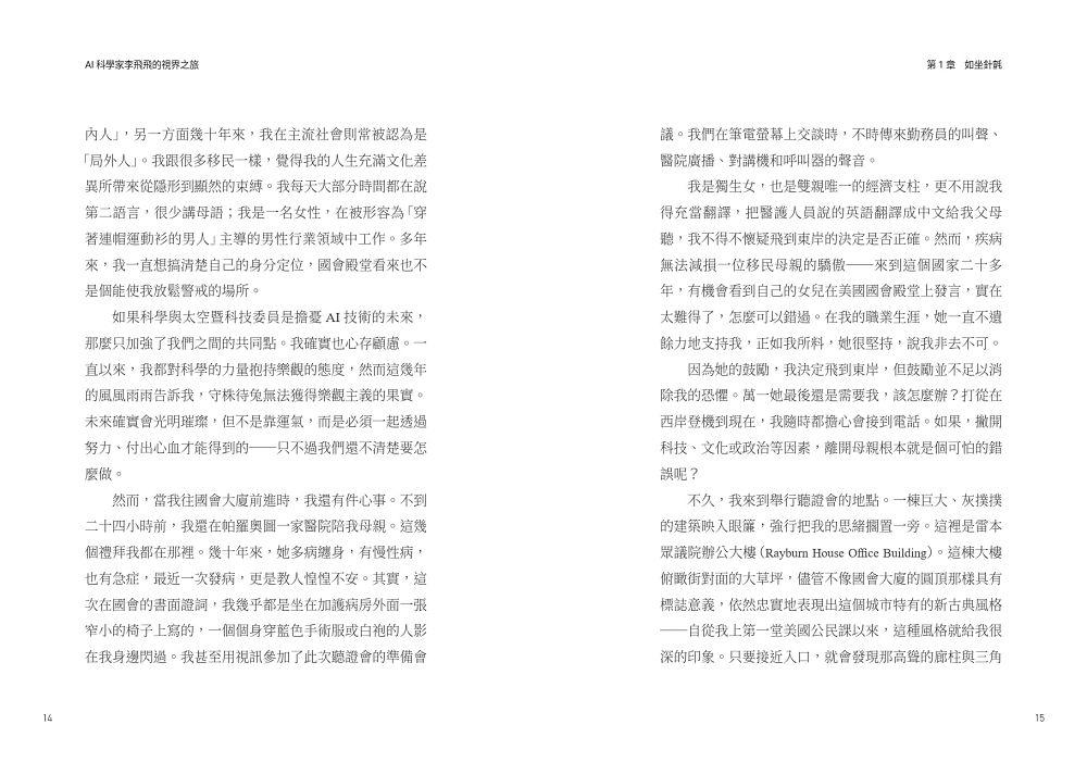 一本迷人、勵志的回憶錄。本書透過李飛飛從社會底層到人工智能關鍵夢想家的非凡軌跡,證明人類的力量與可能性。書中講述她為了發展人工智能技術所做的重要工作,並藉此改善人類現況。——雷德.霍夫曼(Reid Hoffman),Linkedin和Inflection AI共同創辦人,《高成長思維》作者