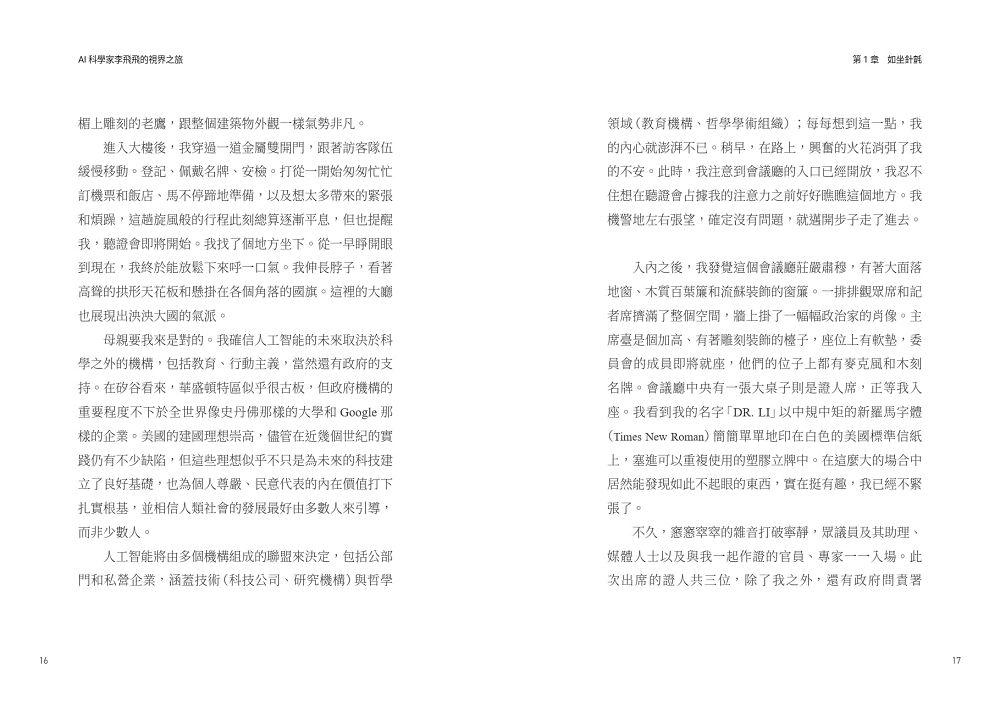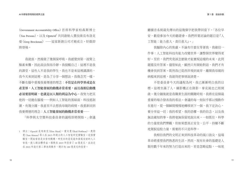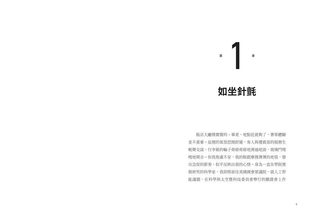 我就座,然後做了幾個深呼吸。我感覺到第一波腎上腺素來襲,因此設法保持冷靜。我提醒自己:這裡不是我的課堂,這些人不是我的學生,我也不是來這裡講課的,我今天來到這裡,是為了分享一個想法。我像念咒一樣,不斷在腦中重複我要傳達的理念:不管是在科學界或是在產業界,人工智能發展的動機非常重要,而且我相信動機必須要很明確,也就是以人類的利益為中心。我努力把其他的一切拋在腦後──例如人工智能的黑暗面、科技抵制潮,有幾分鐘,我甚至不去想我母親的病情。我重新回到我要傳達的理念:人工智能發展的動機非常重要……「科學與太空暨科技委員會的議程即將開始。」會議廳擴音系統最先傳出的這幾個字把我帶回當下。「各位早安,歡迎參加今天的聽證會。我們所要討論的題目是『人工智能:能力愈大,責任愈大』。」